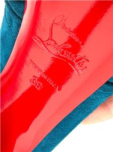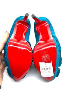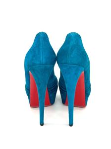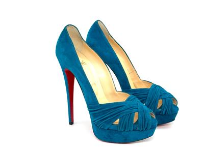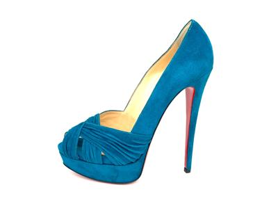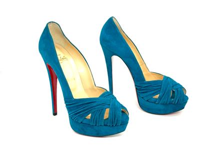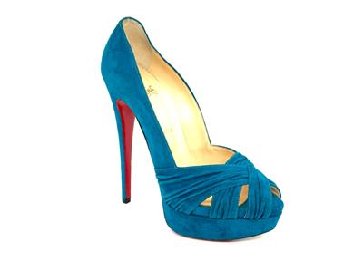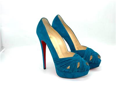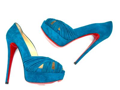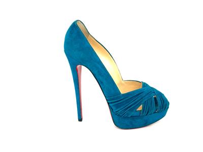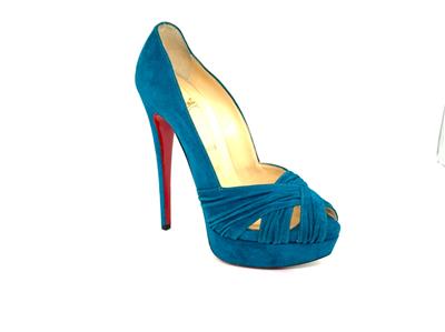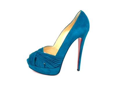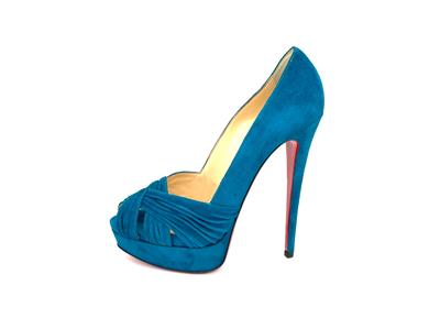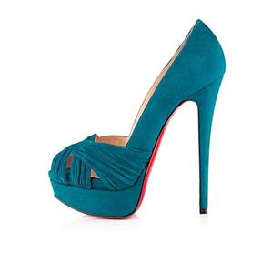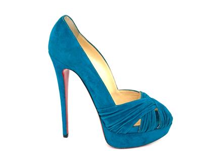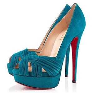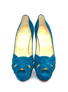 Overlapping suede straps across the toe add interest and texture to a classic suede pump.Suede with ruched, interwoven strap details. Peep-toe. Padded leather insole. Signature red leather sole. 1.5" double platform. Made in Italy. Color: Peacock.