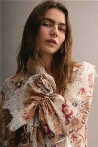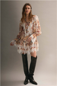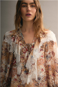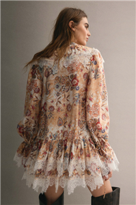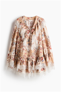 Short, oversized dress in woven fabric with lace-trimmed edges. Low-cut V-neck at front with lacing and ruffle trim, long balloon sleeves with flared cuffs and a drawstring at wrists, and a layered, gathered skirt. Unlined.