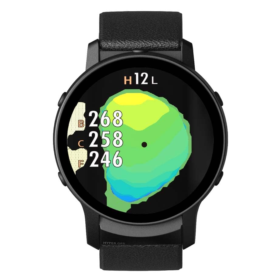 Key Features: AMOLED (organic light-emitting diode) display, 1.43-inch display, layup and recommended club function, hybrid measurement, 3-point distance measurement, magnetic strap, dual touch and button operation, compatible with GL04PRO. Dimensions: Approx. φ47mm x 13.5mm. Wrist circumference: Approx. 150-240mm. Weight: Approx. 50g. Display: 1.43-inch AMOLED (organic light-emitting diode) touchscreen. Battery: Lithium-ion. Continuous use: Up to approximately 10 hours (in GPS mode with a 1:3 screen display on/off ratio). External interface: Bluetooth Low Energy 5.2. Water resistance: 3 ATM. Positioning method: L1C/A (GPS/Michibiki), L1S (Michibiki). This golf watch is multifunctional yet offers exceptional comfort, ease of use, and a stylish design. It features a 1.43-inch AMOLED (organic light-emitting diode) display. Brightness can be adjusted via dual touch and button operation. Equipped with hybrid measurement that takes weather information into account.