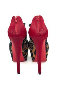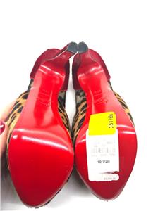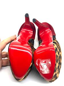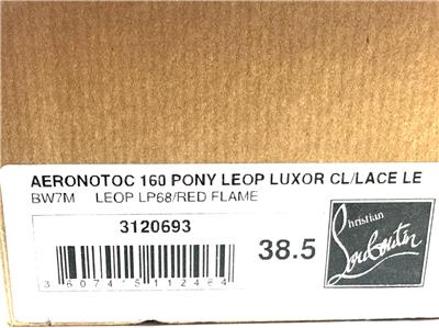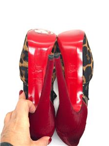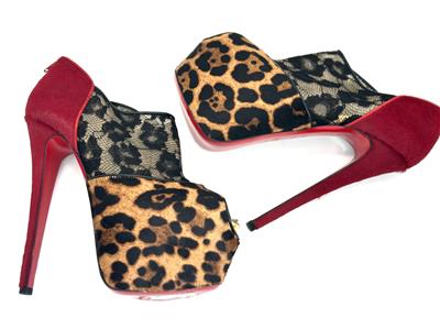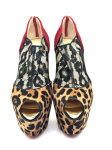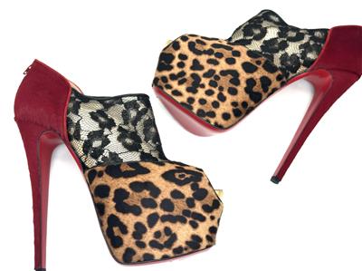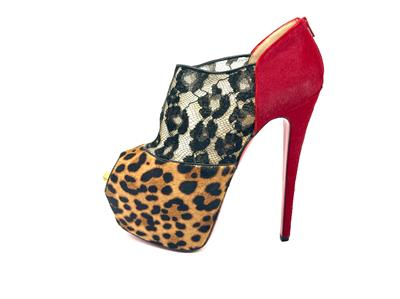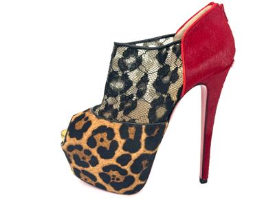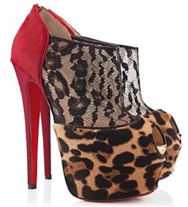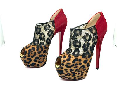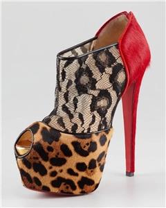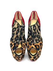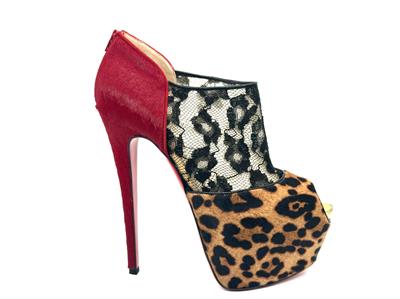 Stand out in a crowd with this leopard-print peep toe ankle boot rendered in lush calf hair and semi-sheer lace. Calf hair-covered heel (160mm). Hidden platform, 2.5". Calf hair and lace upper with leather trim. Peep toe. Back zip. Leather lining. Signature red leather sole. Padded insole. Made in Italy.