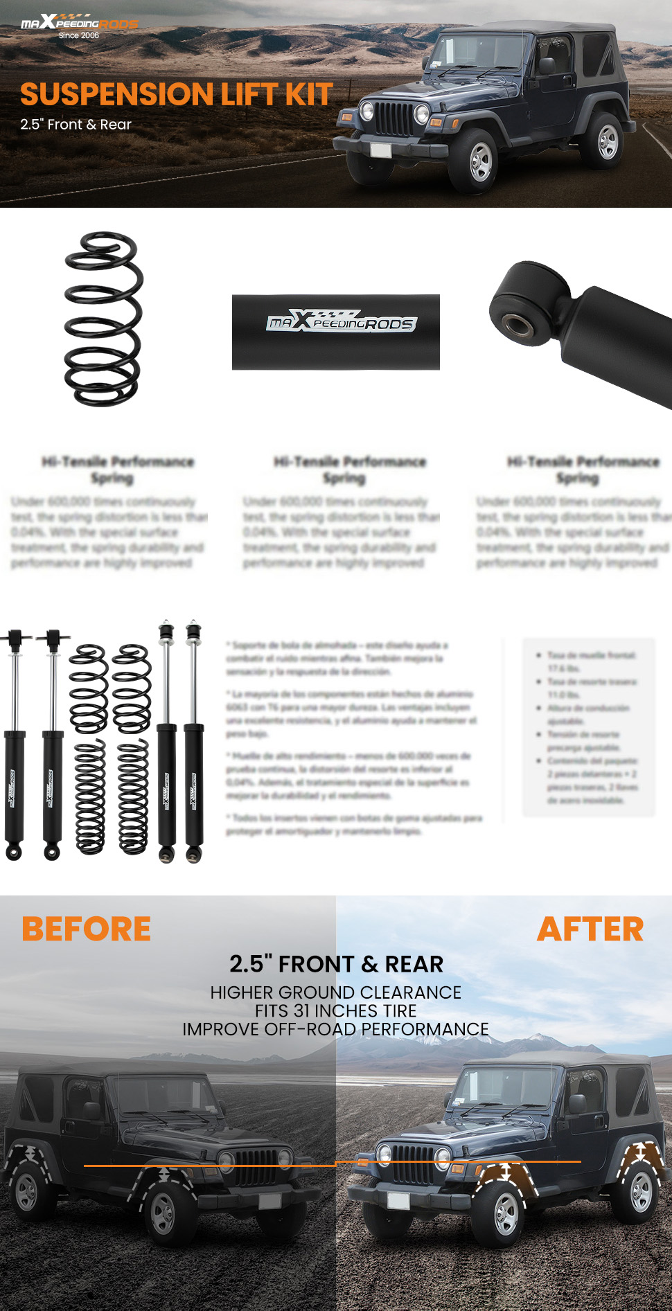 2.5" Lift Kit For Jeep Wrangler TJ 4WD 1997-2006;Does not work with 6 CYL Engines