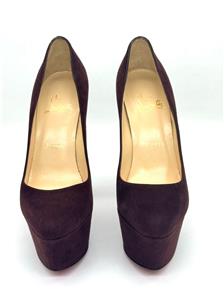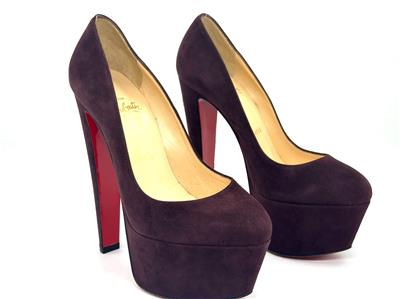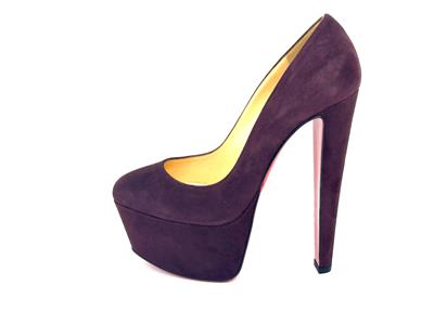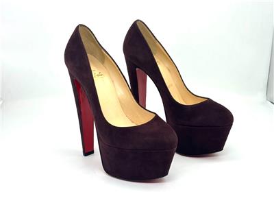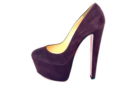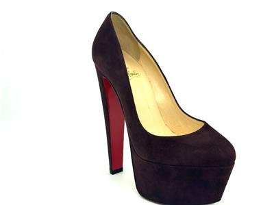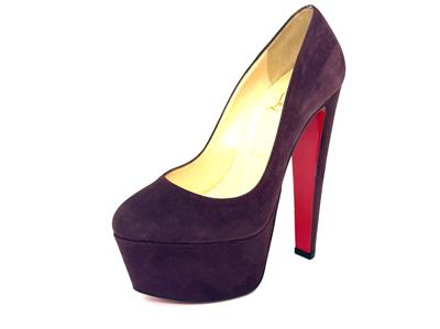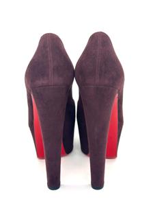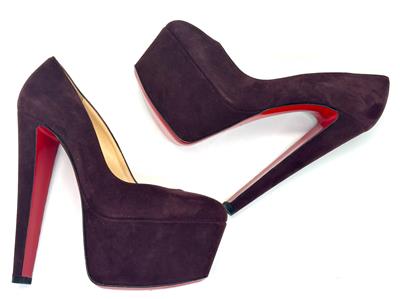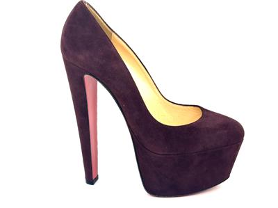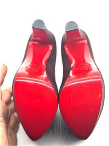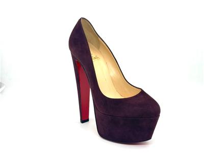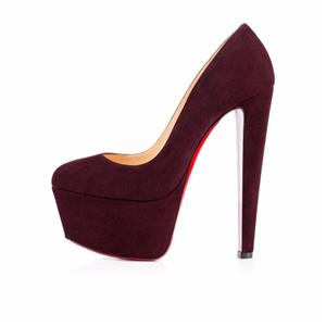 Crafted of rich plum burgundy suede, Christian Louboutin's Alta Vicky platform pumps are styled with towering 2" platform and closed almond shaped toe.