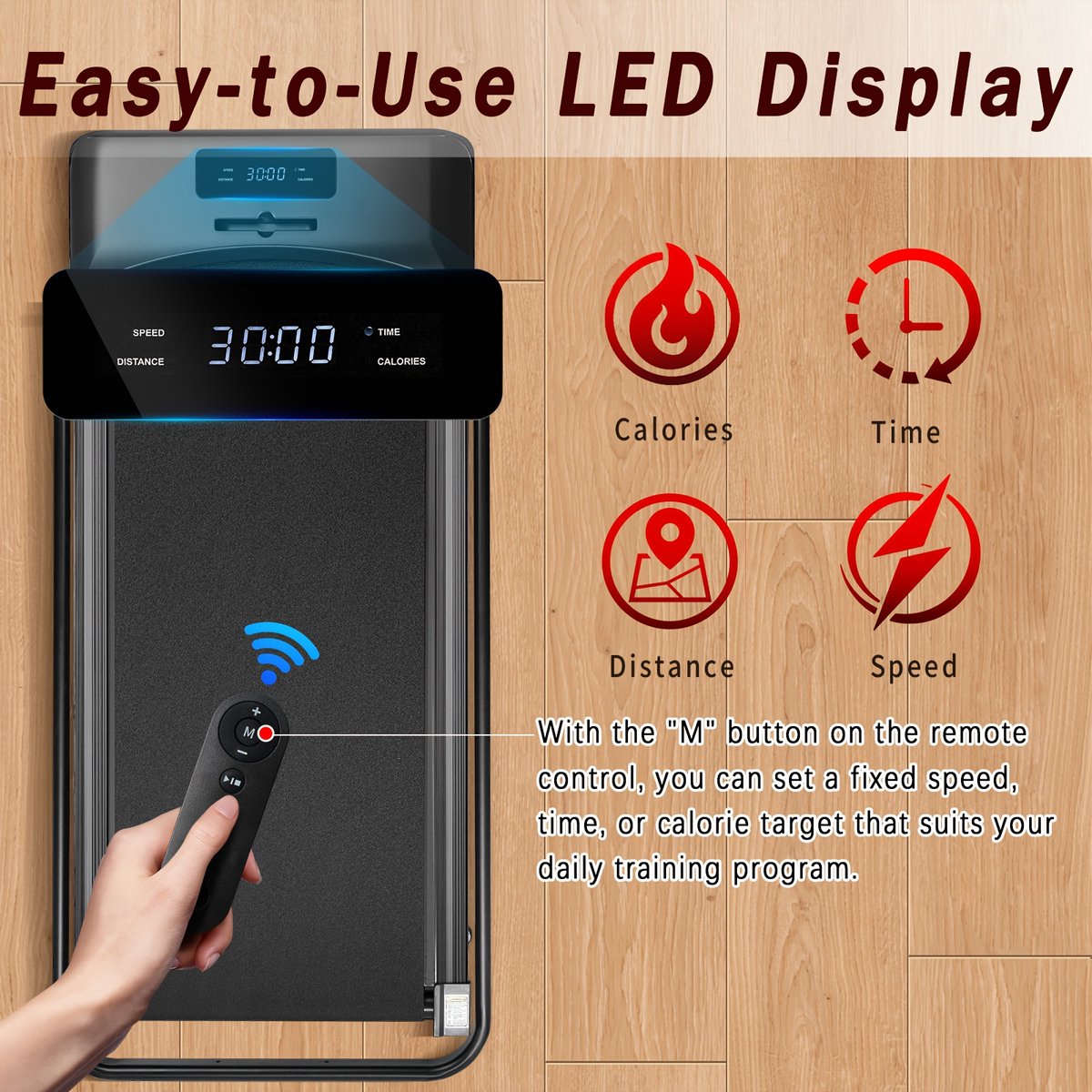 【FERNBEDIENUNG&LED-ANZEIGE】Steuerung ausschließlich per Fernbedienung: Start/Stop, Tempo (+/−), Modus/Timer ohne Absteigen; keine App nötig. Das LED-Display zeigt Zeit, Geschwindigkeit, Distanz und Kalorien in Echtzeit. So behält man sein Laufband-Training jederzeit im Blick – am Ende der Einheit passt das Walking Pad perfekt unter den Schreibtisch und bleibt als Treadmill-Alternative stets einsatzbereit