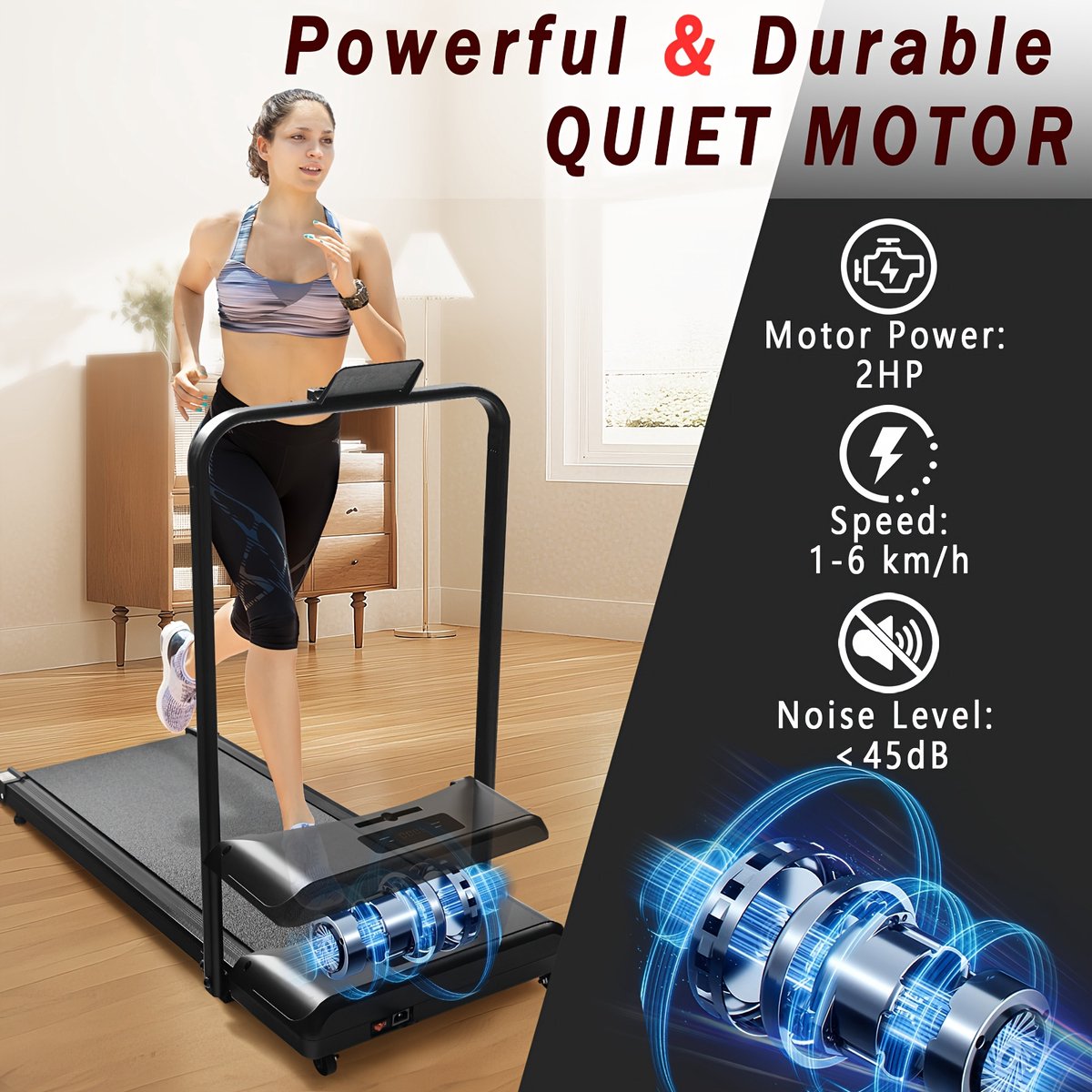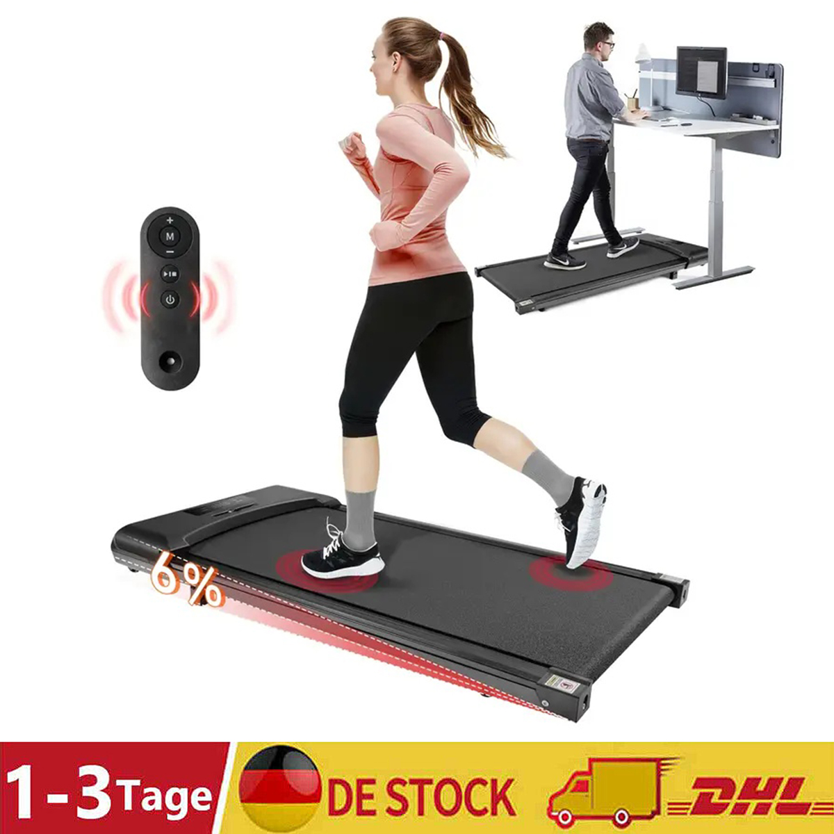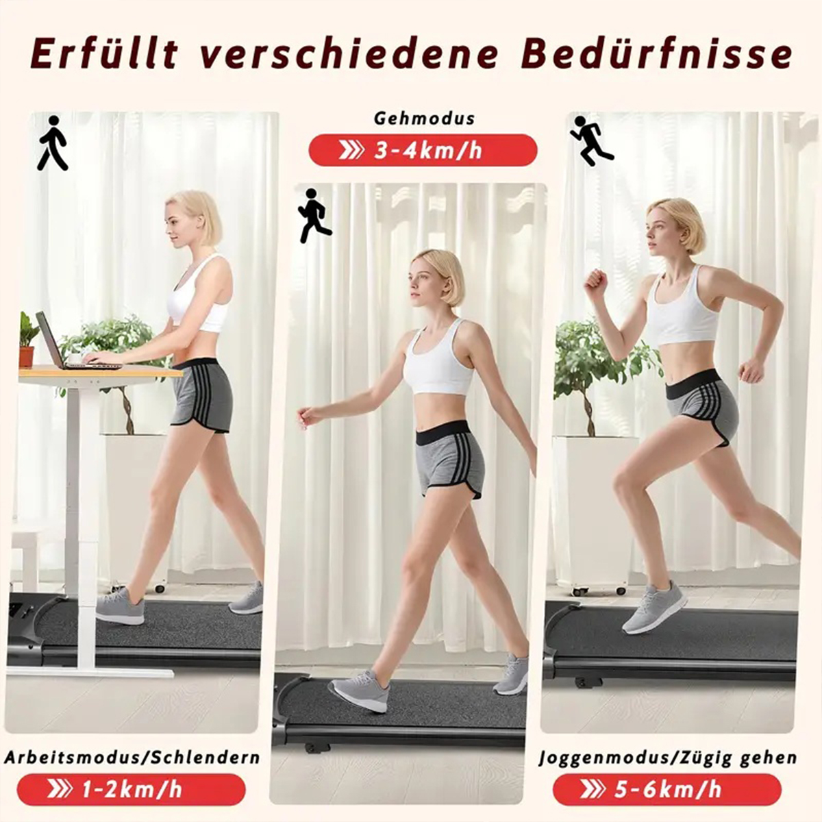 【LEISE&FEIN DOSIERBAR】Walking Pad für ruhiges Training, ca. 45 dB; ideal für konzentriertes Arbeiten im Home-Office. Untertisch-Laufband mit Geschwindigkeitsbereich von 1,0–6,0 km/h in 0,1-Schritten für präzises Tempo. Rutschfeste Lauffläche und stabile Standfüße geben Halt – nach der Session profitiert man von gleichmäßigem Gehen, leichtem Cardio und täglichem Home-Workout im Wohnzimmer oder im Büro