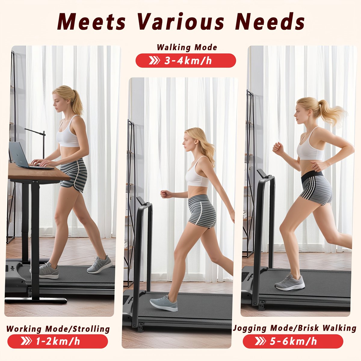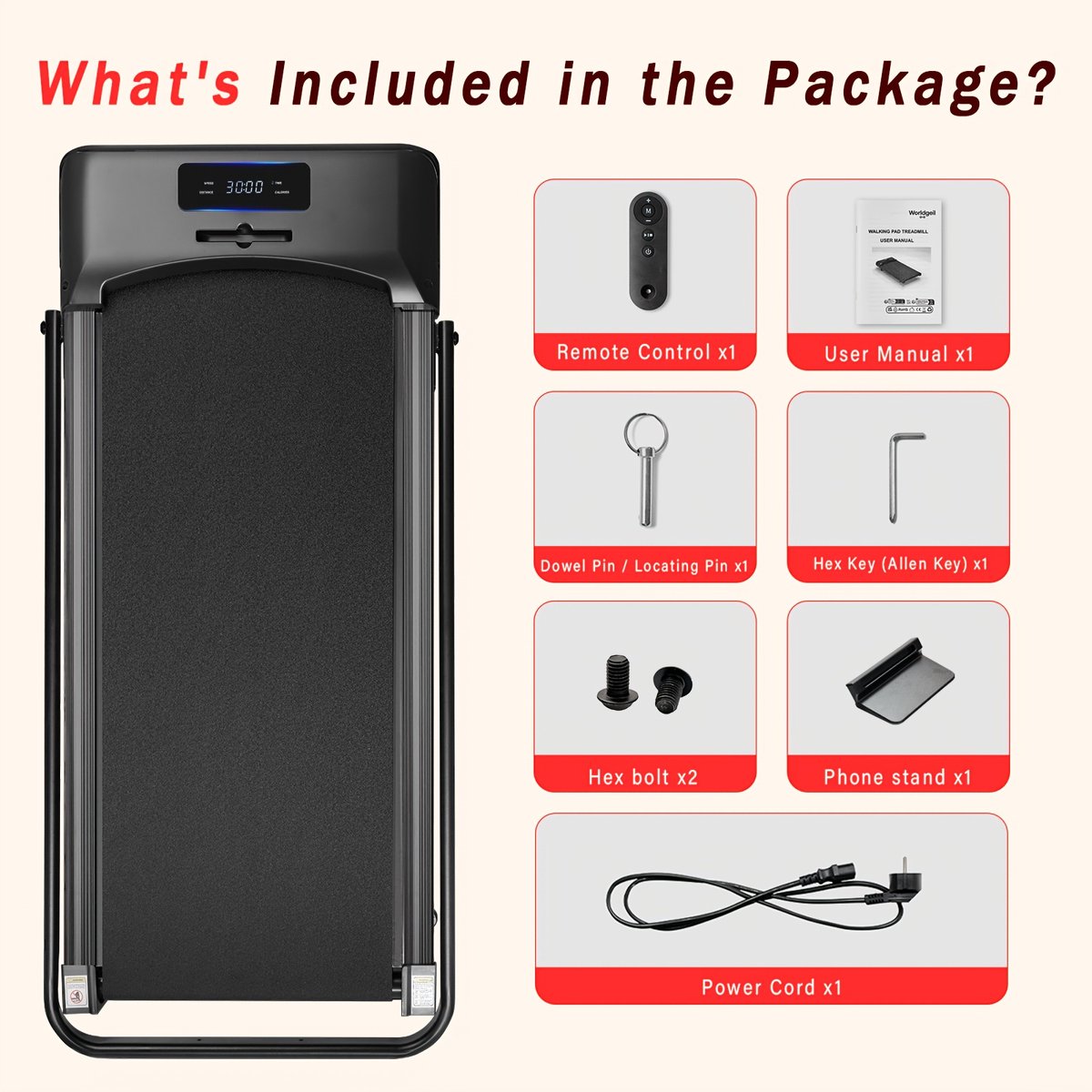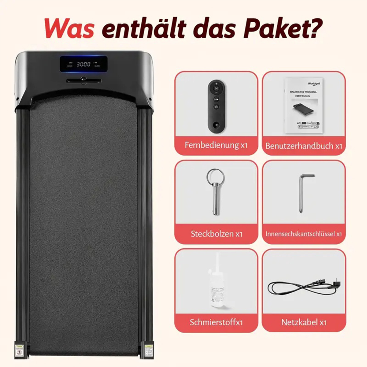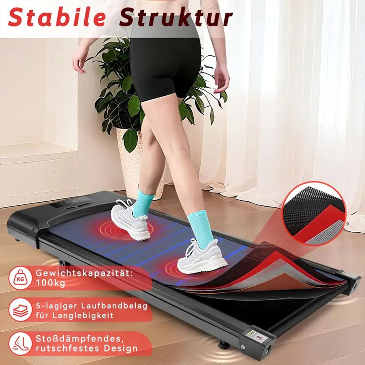 【STABIL&SICHER】Robuster Rahmen bis zu 100 kg Benutzergewicht; rutschhemmende Standfüße minimieren das Verrutschen auf ebenem, trockenem Boden. Vor dem Start Standsicherheit prüfen und rundum Sicherheitsabstand wahren. Zu Beginn sorgt die rutschfeste Lauffläche für kontrollierte Schritte, am Ende überzeugt das Gerät als Schreibtisch-Laufband für Einsteiger und regelmäßiges Walking-Pad-Training zu Hause