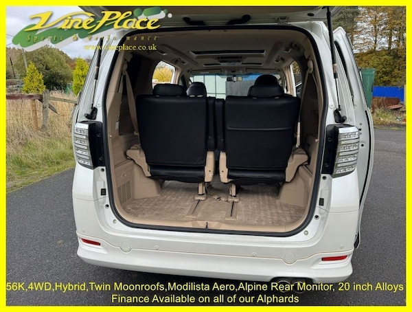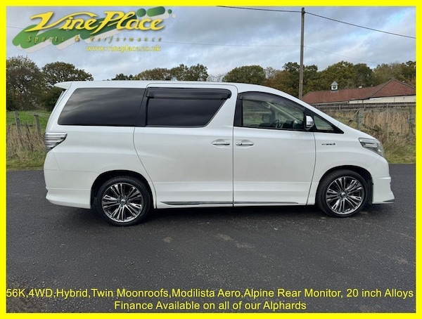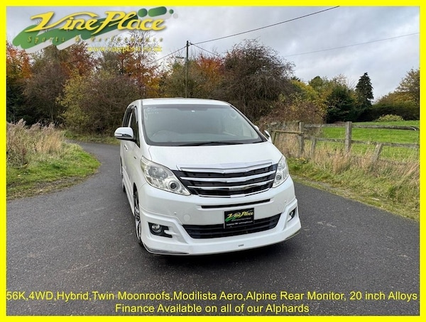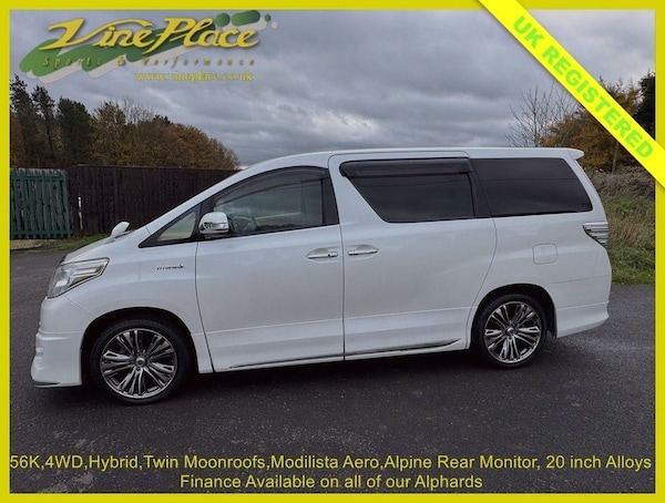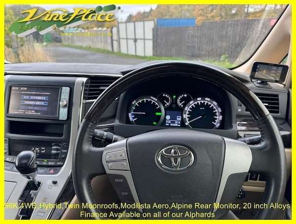 The second-generation Alphard/Vellfire Hybrid was introduced in 2011 and uses a 2.4 petrol engine along with a later more advanced Toyota Hybrid System II with Eco and EV mode. It is 4WD. The vehicle has a class-leading official Japanese fuel consumption of up to 53.6 MPG.This is a fantastic specification car with twin sunroof. power door, full Modilista Aero kit, Upgraded alloys, DVD and rear monitor. Seats are cream cloth with leather look fitted covers in black. + ULEZ Compliant (London). + Fresh from Japan. + 55K warranted miles with BIMTA/AA mileage certificate. + Grade 4 vehicle (non-accident history in good order). + All factory recalls carried out. + 7 Seats. + Black leather look seat covers (Beige underneath). + Leg rest on middle seats. + 4 Wheel Drive. + Twin moonroofs. + Rear drop down monitor. + DVD. + Colour reverse camera. + Front parking sensors. + Rear parking sensors. + Power door.. + Cruise Control. + Factory fitted ISOFIX. + Front and Side Airbags + Keyless entry and starting. + Optional Modellista aero kit. + Upgraded Alloy Wheels + Power and economy mode option. + Traction Control. + Retractable mirrors. + XENON Headlamps for superb night-time vision. + Directional headlamps. (AFS). + Fold up rear seats. + Picnic table. + Toyota alarm and immobiliser security system. + Privacy glass. + 2 Remote key fobs. + Fog light incorporated into original rear light unit. + Exposed areas of floor and chassis to be undersealed with Body-shutz. + Includes Bluetooth adapter to allow streaming to car audio. + Nationwide delivery £199. (£299 Devon, Cornwall, and South/West Wales) + Supplied with comprehensive service and MOT (inc. advisories). + MPH speedometer available as an optional extra. + Full integrated upgrade to Apple CarPlay and Android Auto Available as an optional extra (retains original look). Some original feature will not work. + Road Angelinfotainment with DAB, Apple Car Play and Android Auto available as an optional extra. + This vehicle can be reserved with a deposit of £250, refundable in the unlikely event that when fully prepared you are not entirely satisfied. Explore our extensive selection of Toyota Alphards and Vellfire vehicle, with 20 or more units available for sale in the UK or en-route! Since 1997, Vine Place has been importing a diverse range of vehicles from Japan. The Toyota Alphard holds a special place in our lineup for its exceptional blend of practicality, aesthetics, comfort.