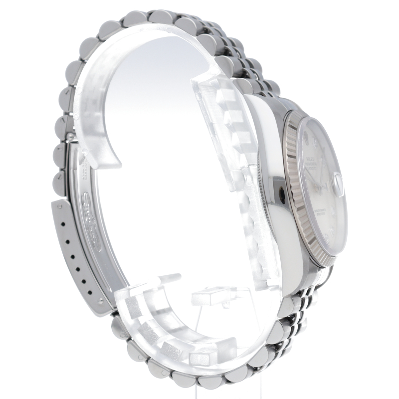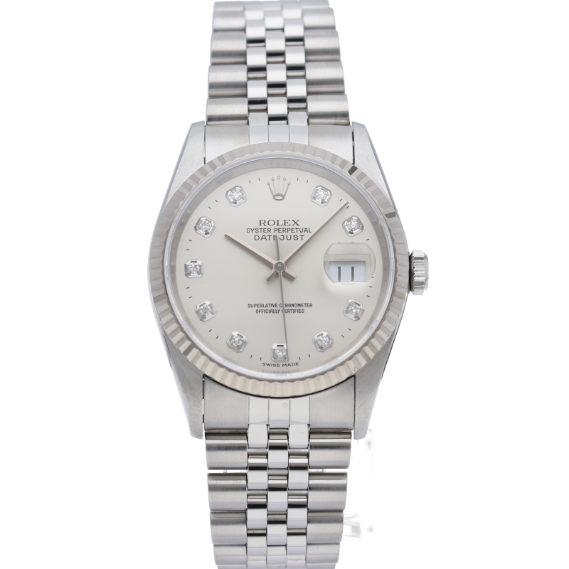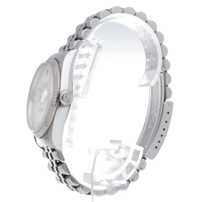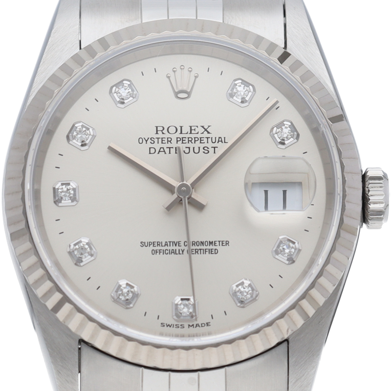 | "Datejust" is a Rolex dress watch loved by people of all ages. 10P diamonds are applied to the combination specification of white gold and stainless steel. |