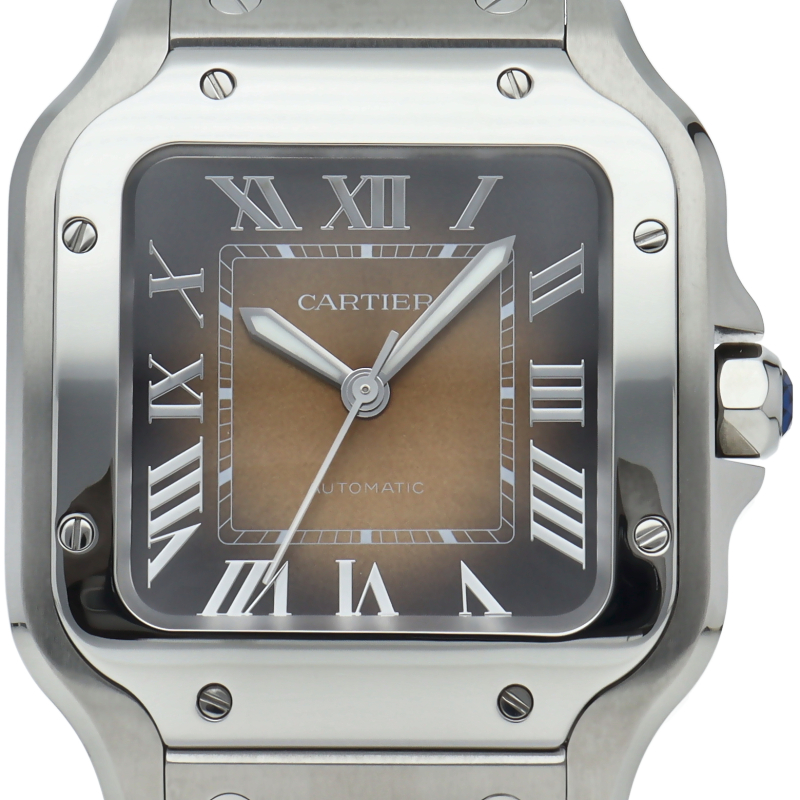 | Santos de Cartier watch, medium model, 1847 MC Mechanical Automatic movement. Stainless steel case, heptagonal crown set with faceted blue synthetic spinel, satin-finished gradient brown sunray-brushed dial, luminescent rhodium-plated polished steel sword-shaped hands, sapphire crystal. |