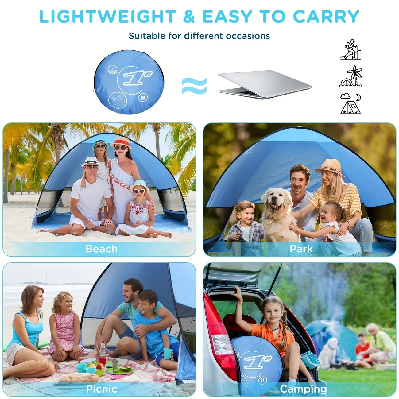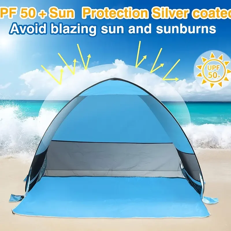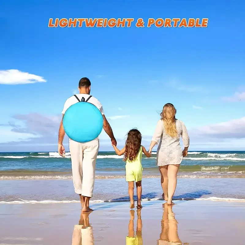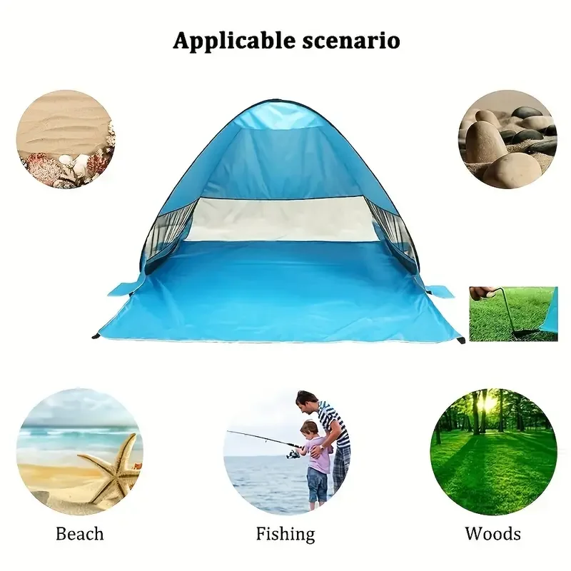 Our pop up sun shelter has an automatic pop-up design, it will pop up in 2 second. It is also easy to fold up and put into a carry bag, making it a great companion for your fun time at the beach.