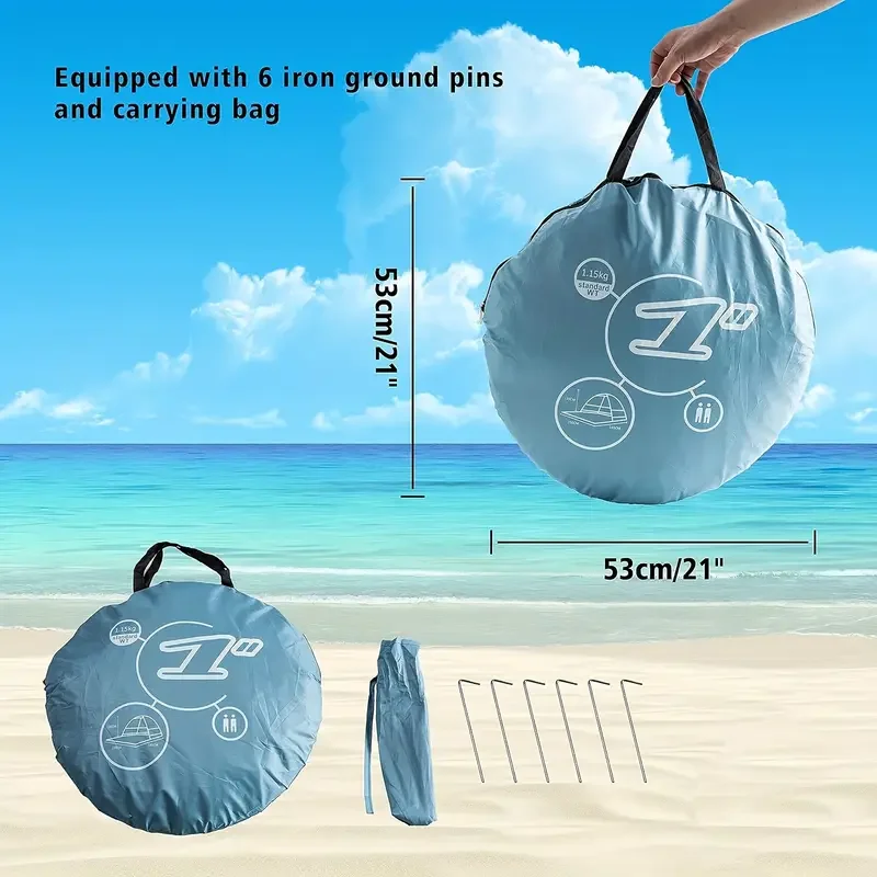 The pop up beach tent open size is78*64*51inch,provides spacious interior space for activities and can comfortably accommodate 2-3 people. It folds to 19.7 x 19.7 x 1.6 inches and fits in a carry bag, weighing only 1.5kg.