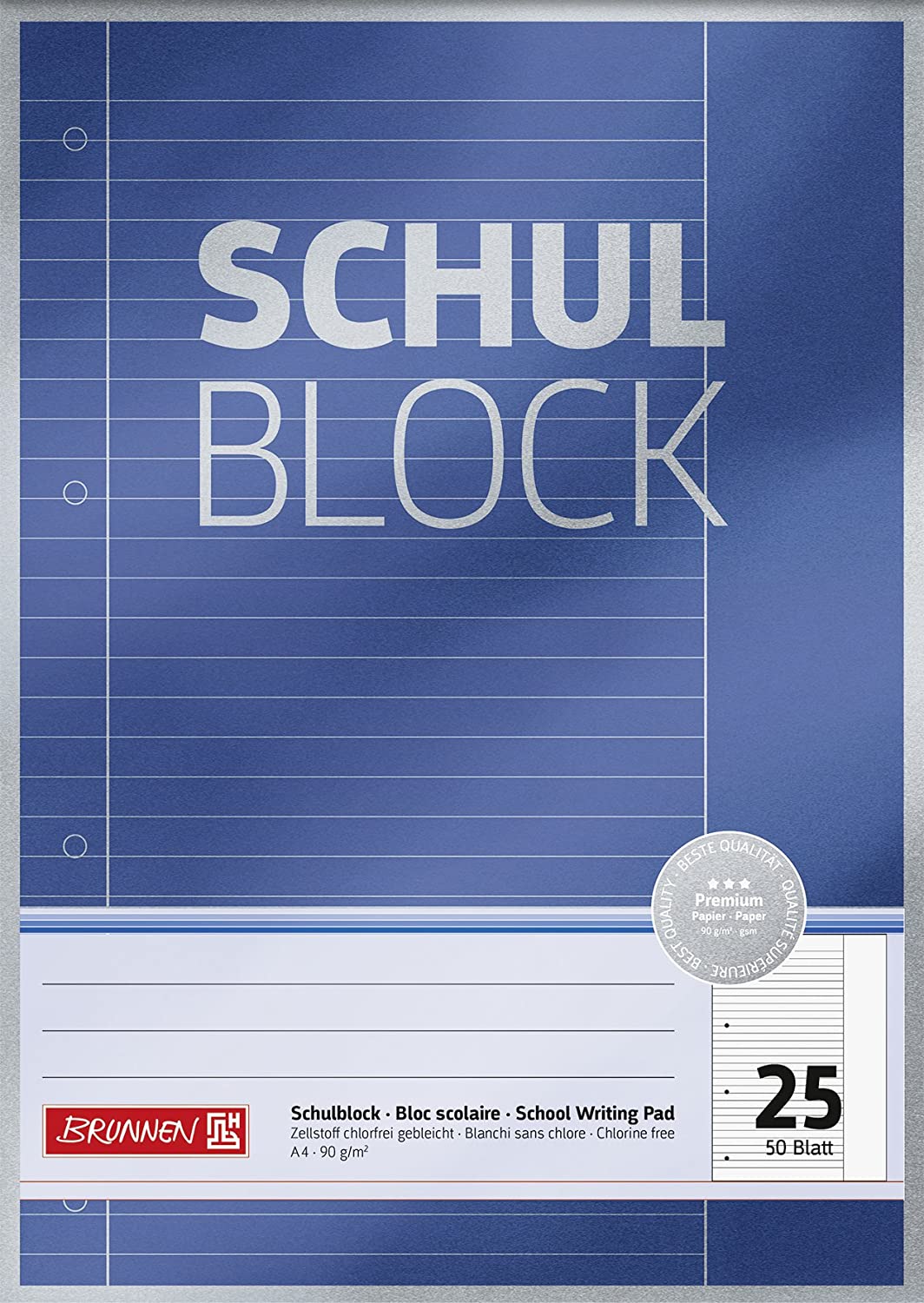 Brunnen Schulblock / Notizblock Premium (A4, 50 Blatt, liniert, mit Rand, Lineatur 25, gelocht, kopfverleimt, 90 g/m²)