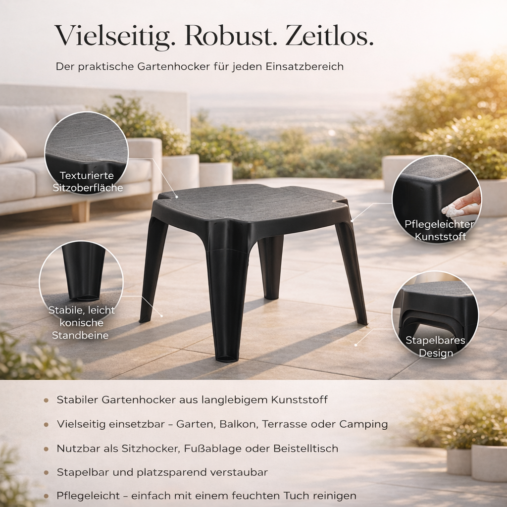Dieser praktische Gartenhocker ist ein echtes Multitalent für Garten, Terrasse, Balkon oder Campingplatz. Dank seines geringen Gewichts lässt er sich flexibel einsetzen und mühelos transportieren.
