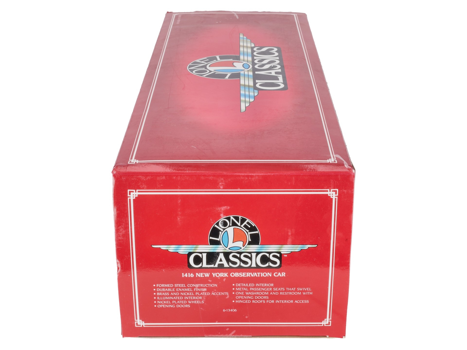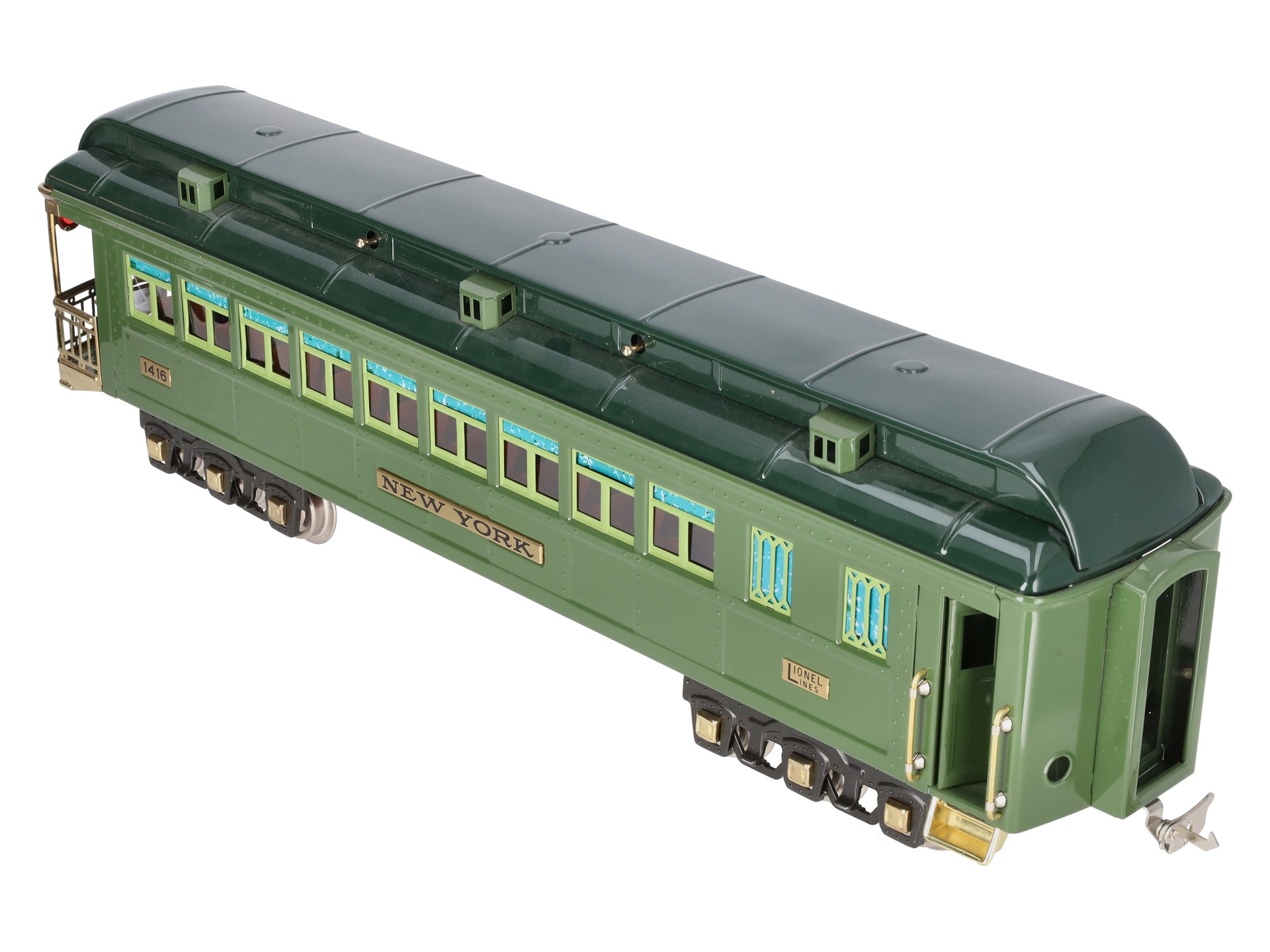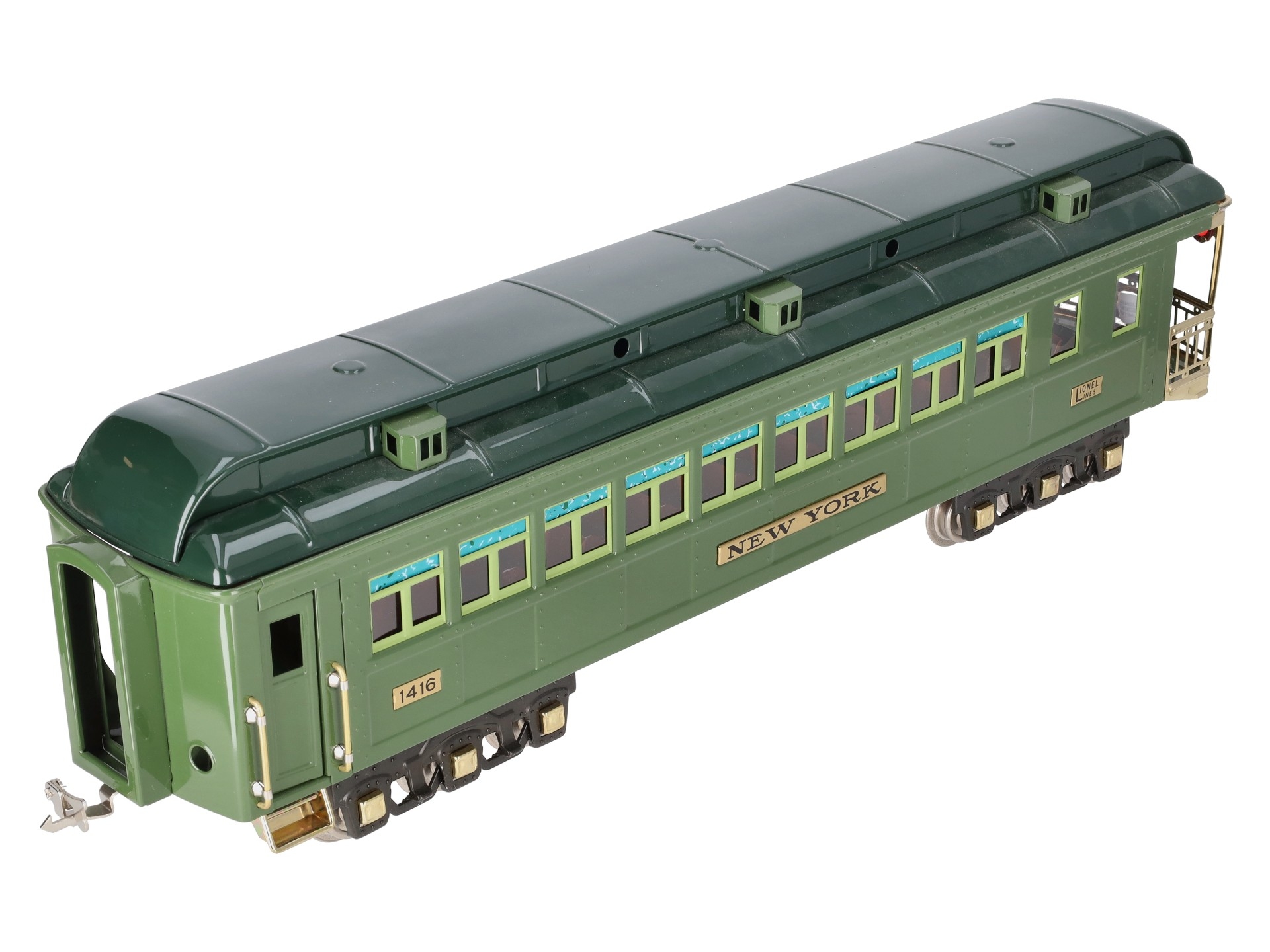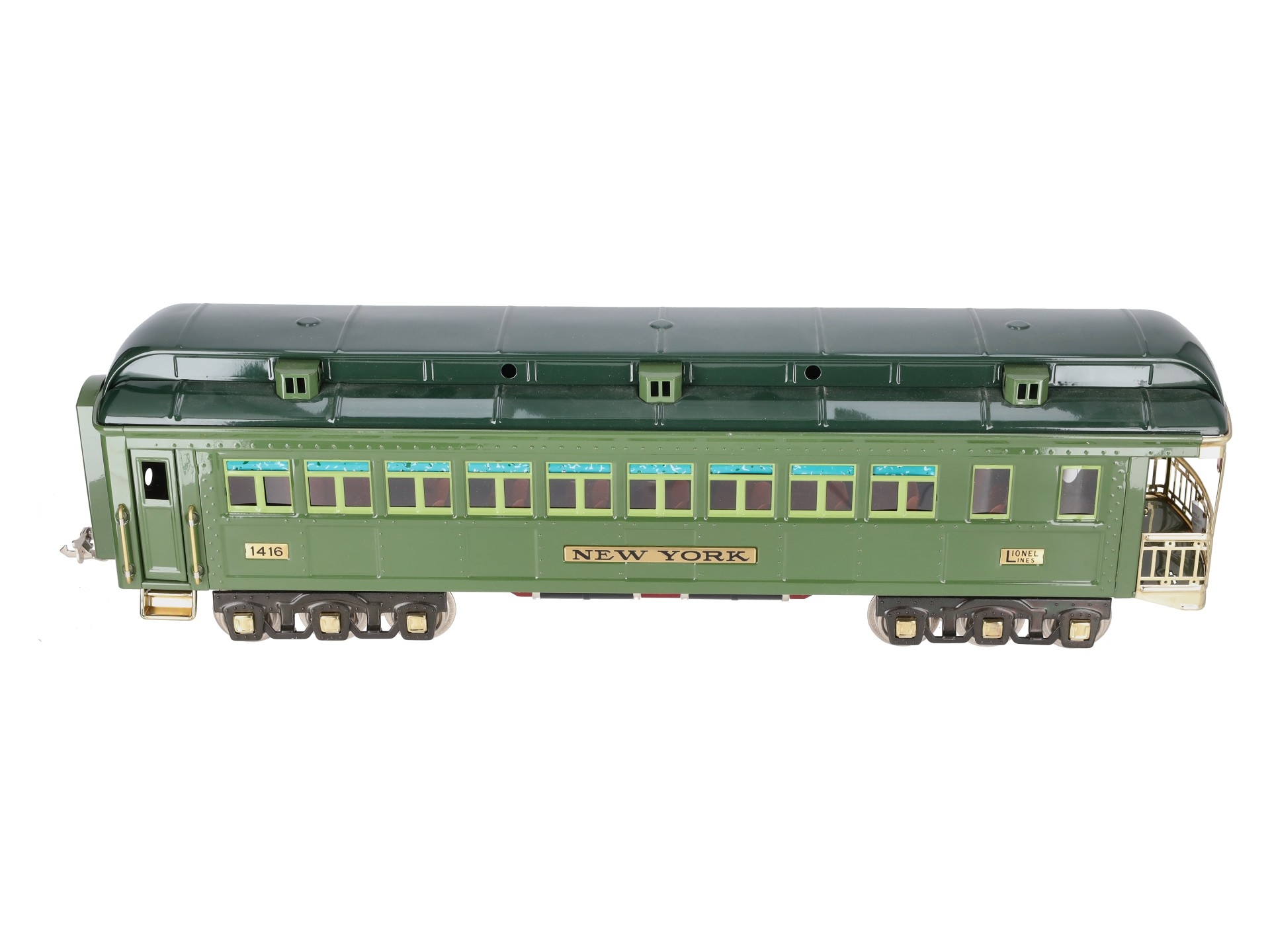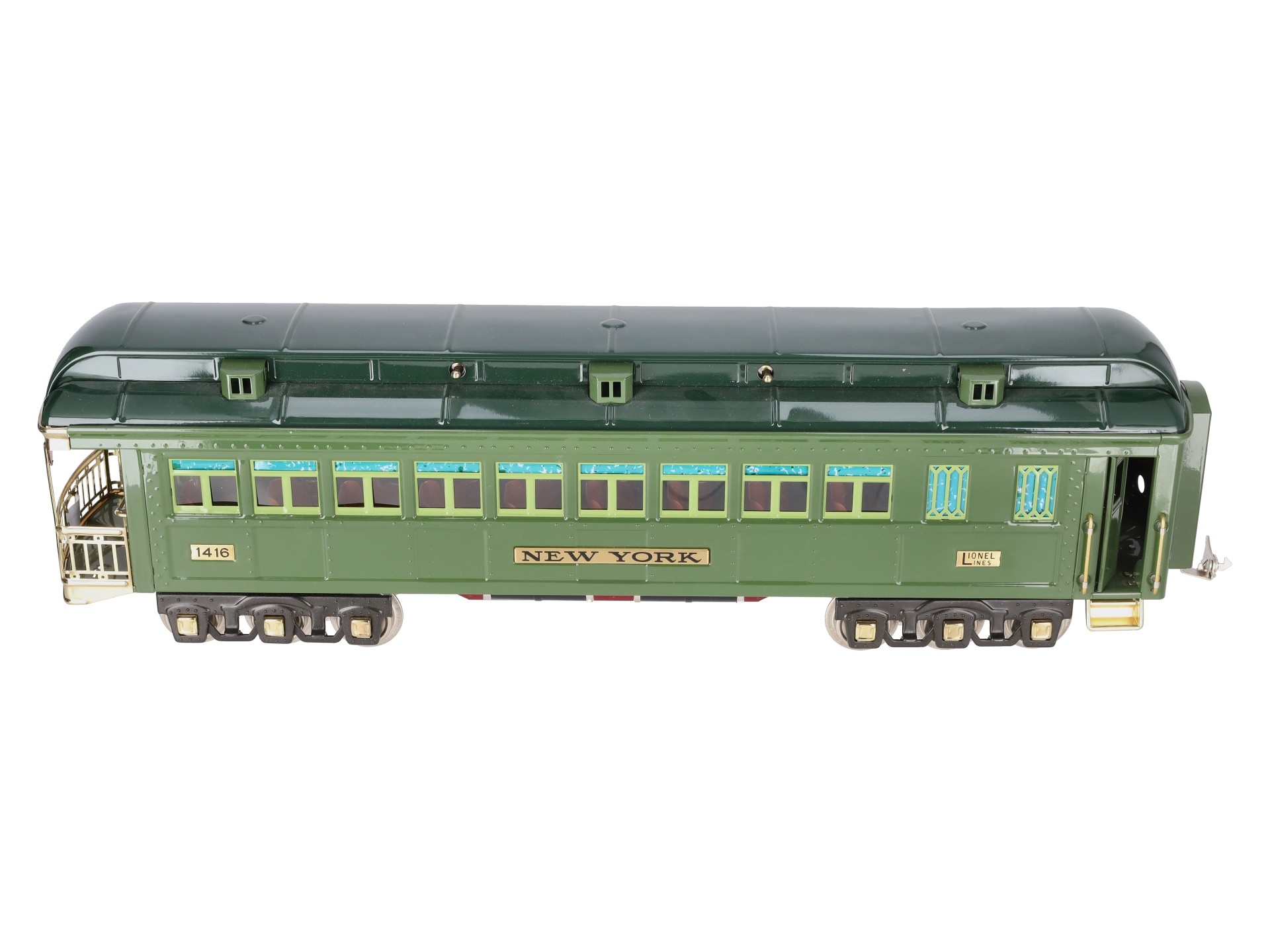 This is a Lionel 6-13406 Standard Gauge New York State Set Observation Car #1416. This car is part of the Lionel Classics State Set and is a reissue of the legendary cars from the late 1920s and 30s. It is lighted and also features all metal construction, a baked enamel finish, hinged roof, latch couplers, and interior details such as chairs and restrooms.