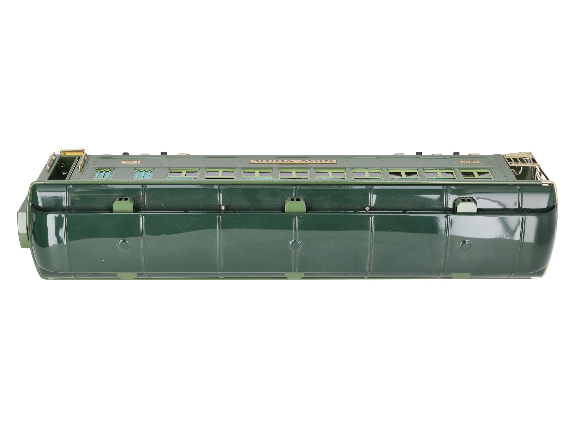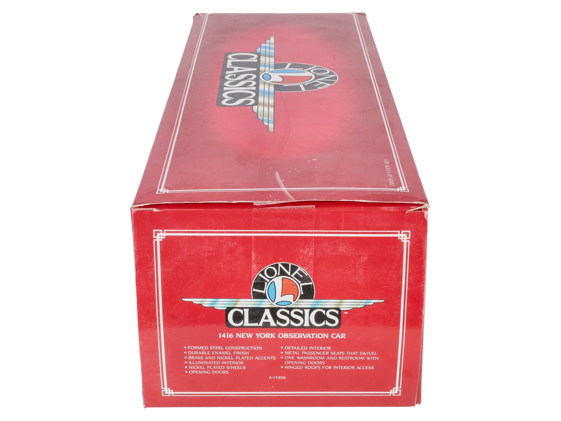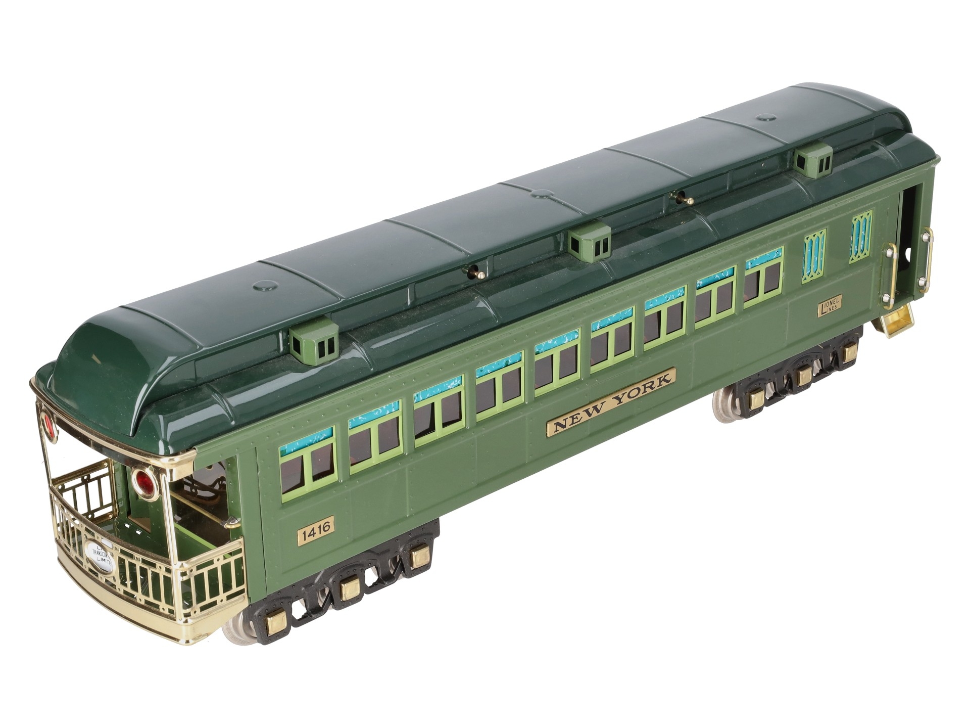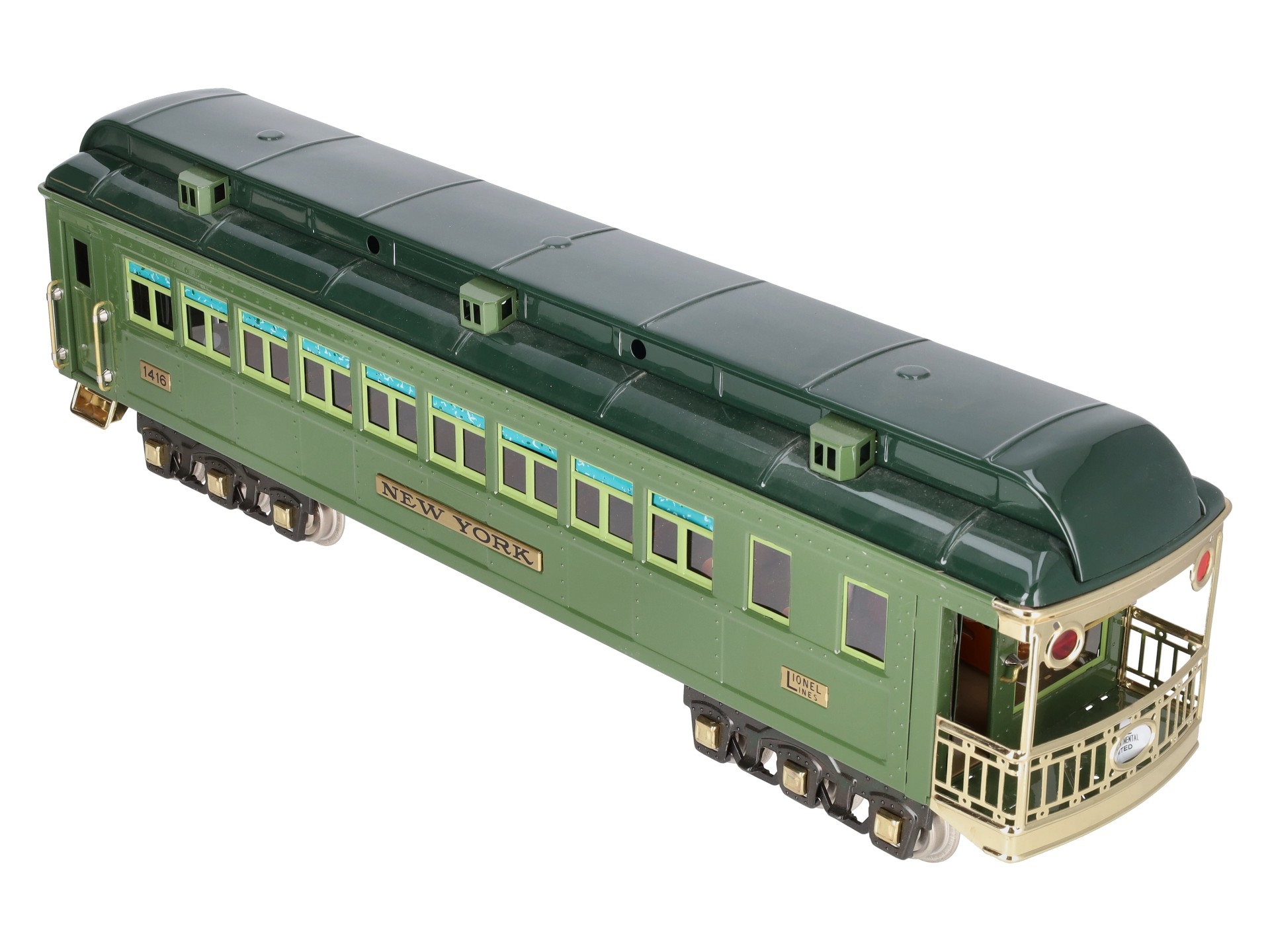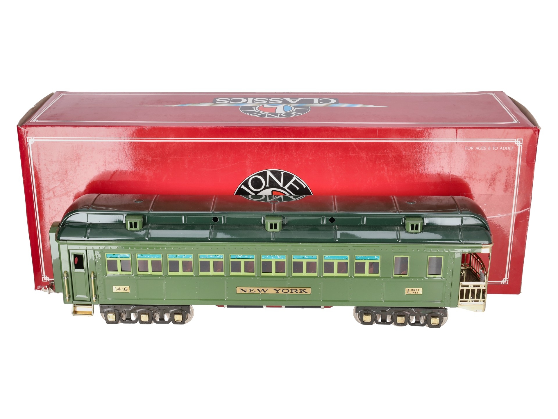 This is a Lionel 6-13406 Standard Gauge New York State Set Observation Car #1416. This car is part of the Lionel Classics State Set and is a reissue of the legendary cars from the late 1920s and 30s. It is lighted and also features all metal construction, a baked enamel finish, hinged roof, latch couplers, and interior details such as chairs and restrooms.