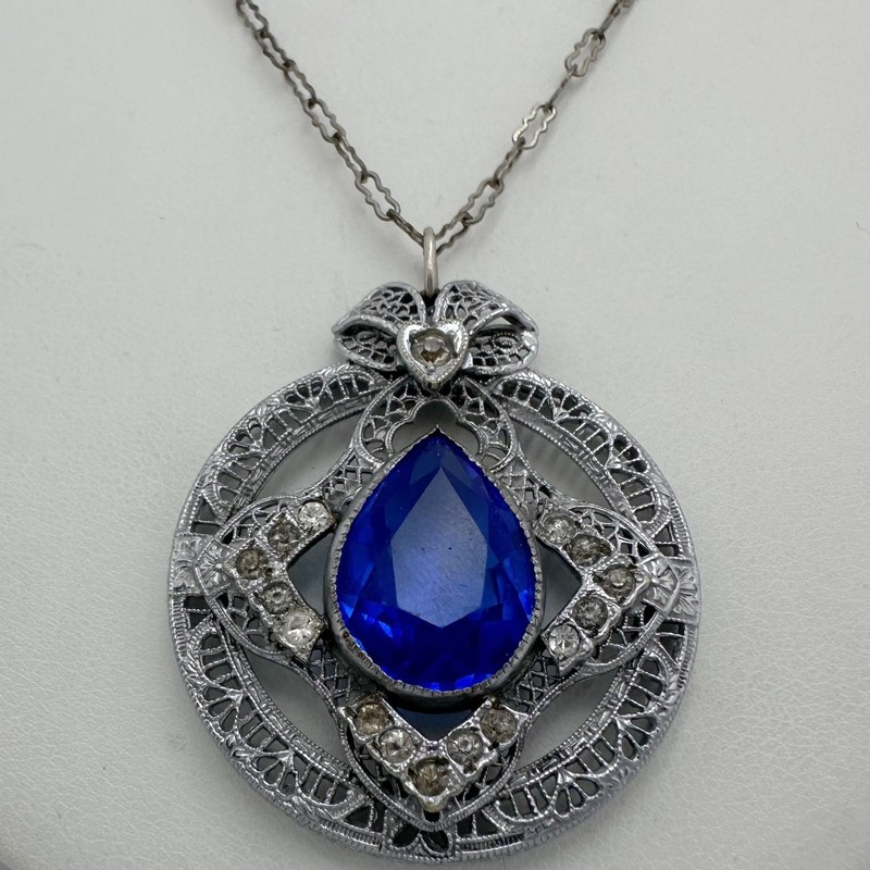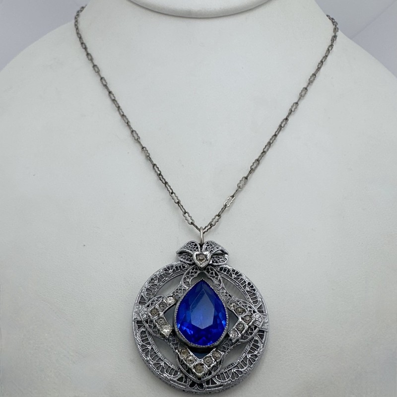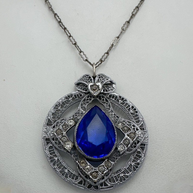 ANTIQUE ART DECO RHODIUM PLATE FILIGREE BLUE CRYSTAL RHINESTONE PENDANT NECKLACE