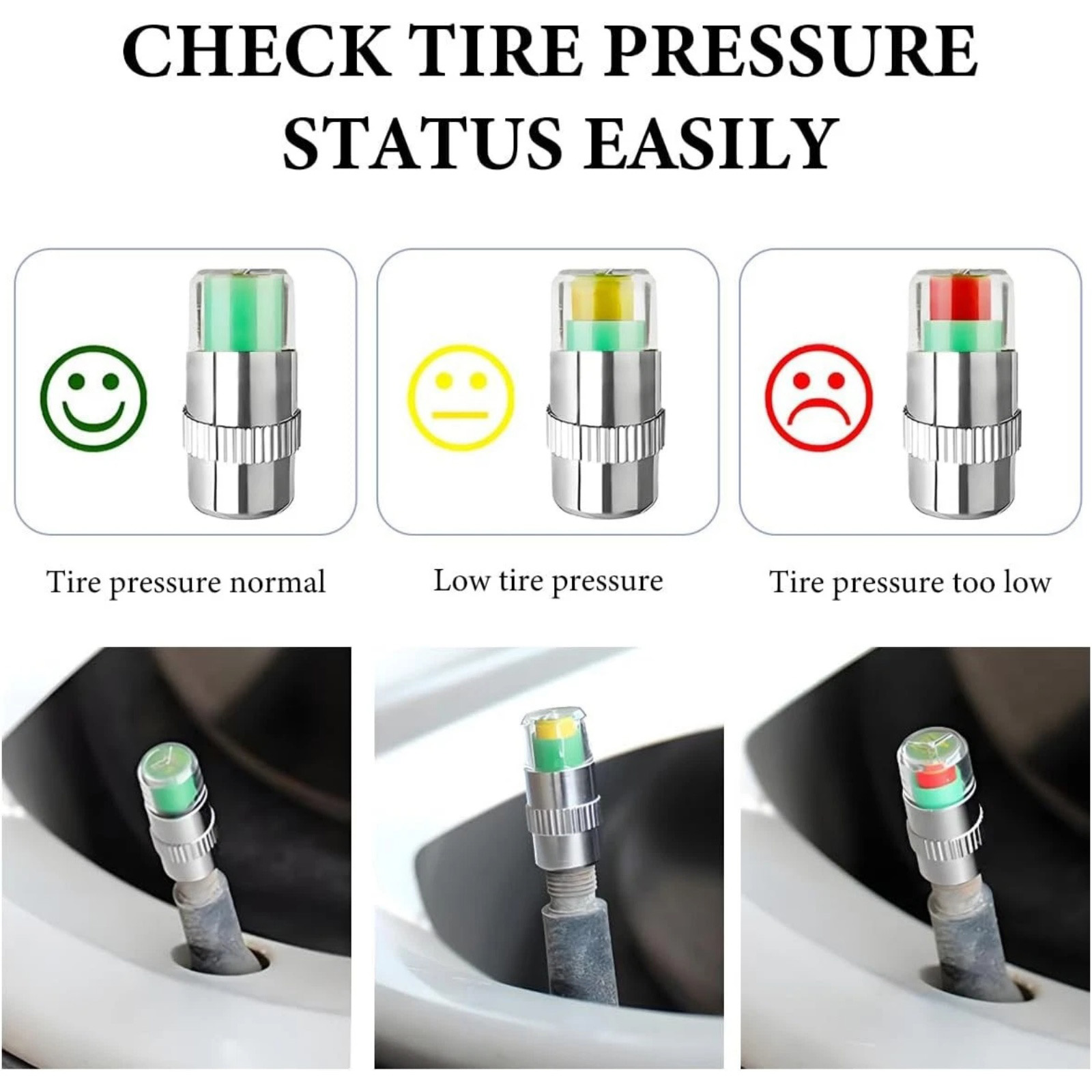 Intuitive 3-Color Visual Alarm: Green: Tire pressure is normal. Yellow: Pressure is below 10% of the standard – caution advised. Red: Pressure is below 25% of the standard – immediate attention required.