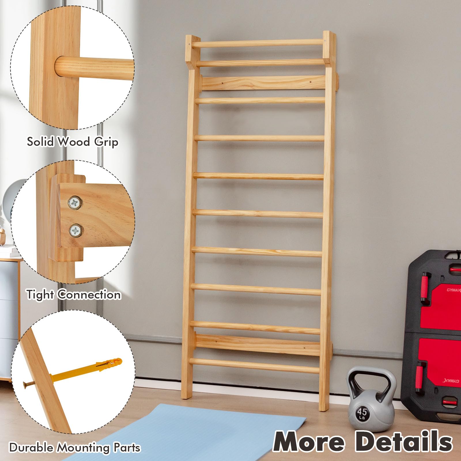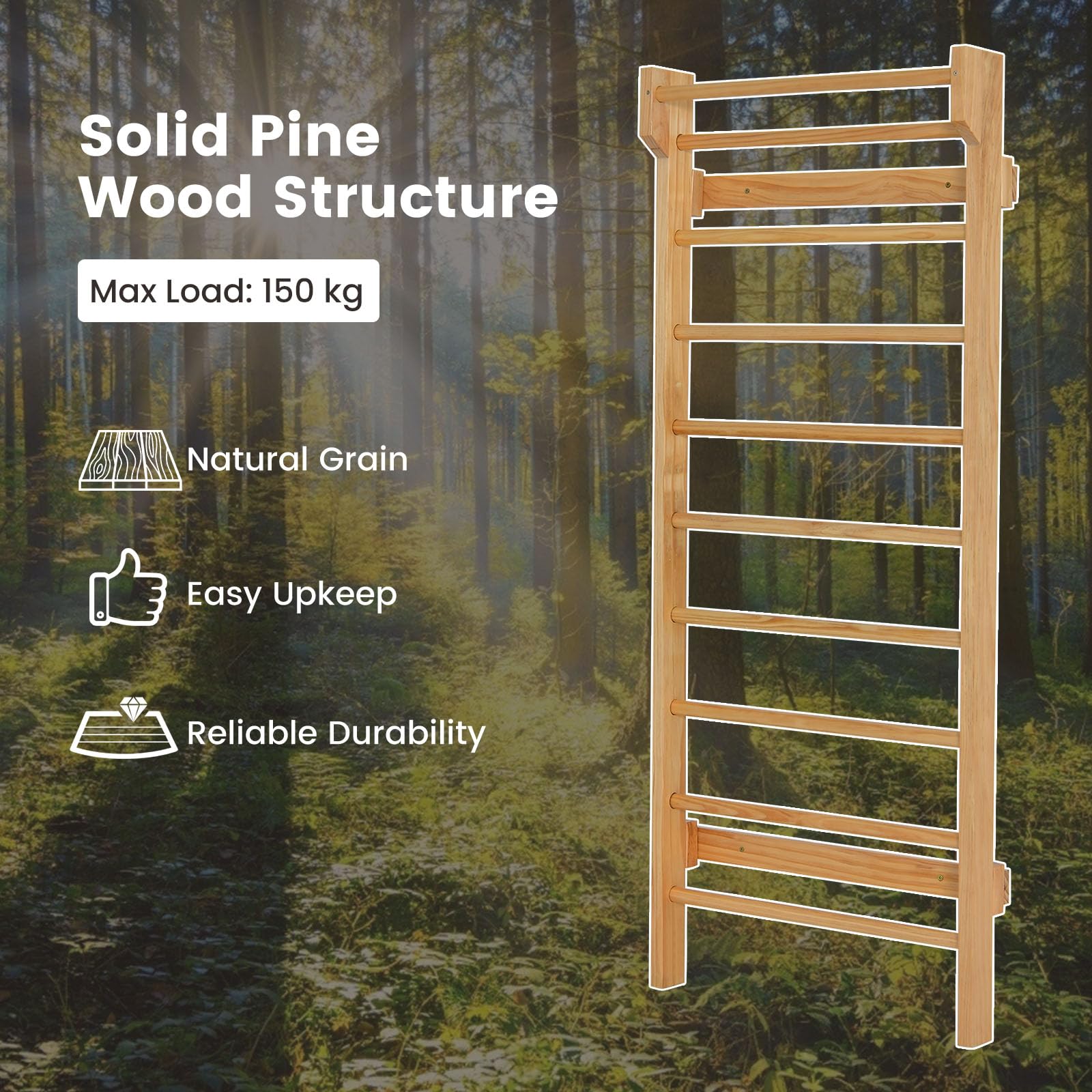 PALESTRA INTERNA: Questa spalliera svedese di legno è progettata per essere collocata all'interno, occupando uno spazio adatto che consente agli utenti di allenarsi in qualsiasi momento, senza essere limitati dalle condizioni atmosferiche. Inoltre, questa spalliera palestra ha diverse funzioni, come scale, piattaforma circolare, adatte a vari tipi di allenamento fisico, inclusi trazioni, addominali, ecc.