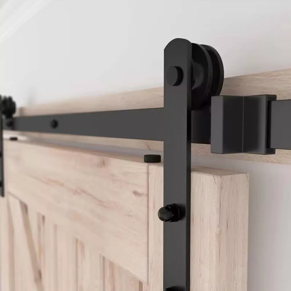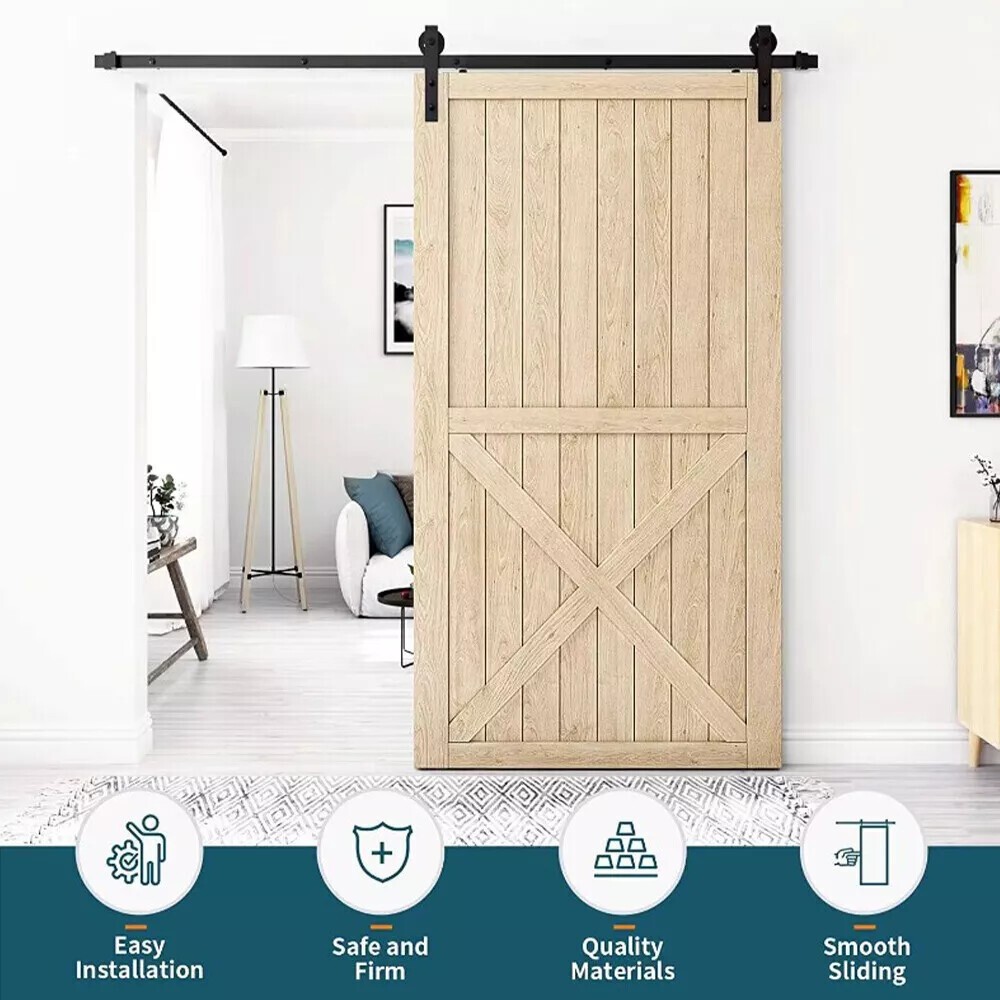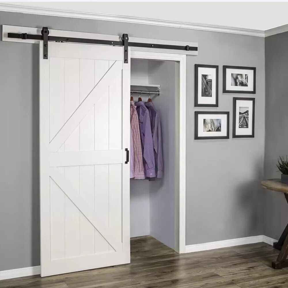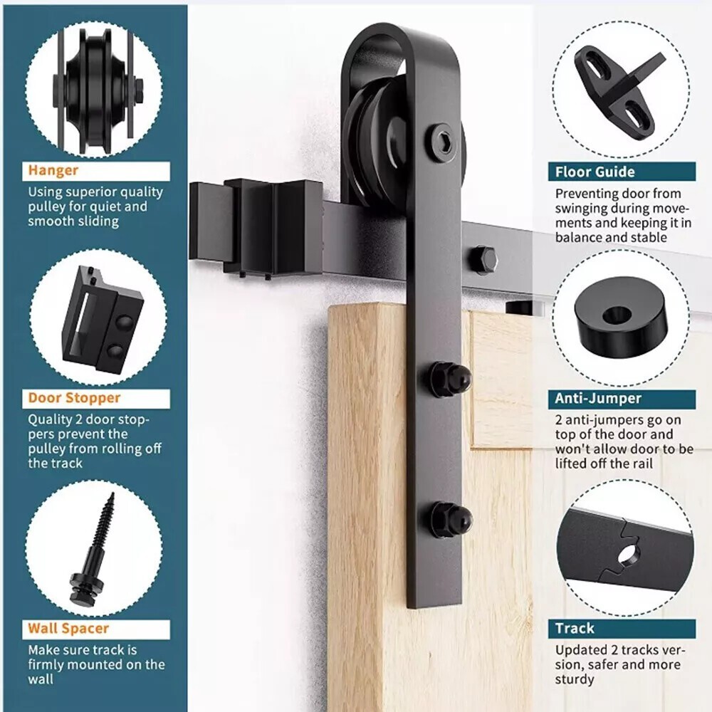▶Barn door hardware kit (3/4 x 1.6 ft. rails, 5 x rail spacers, 2 x rollers, 2 x door stops, 2 x end caps, 1 x floor rail, 1 x hex wrench; all other necessary hardware included Inside, as shown. Fits 16" studs.) Door not included.