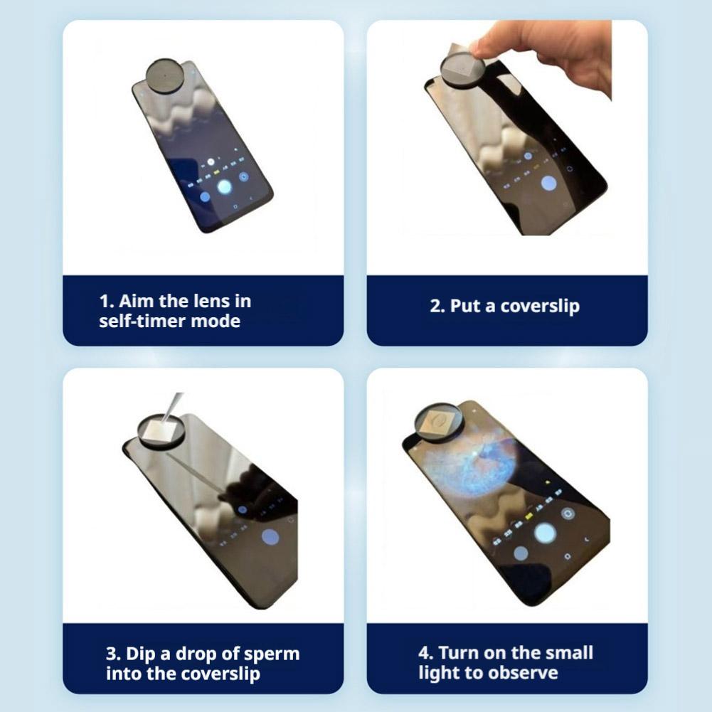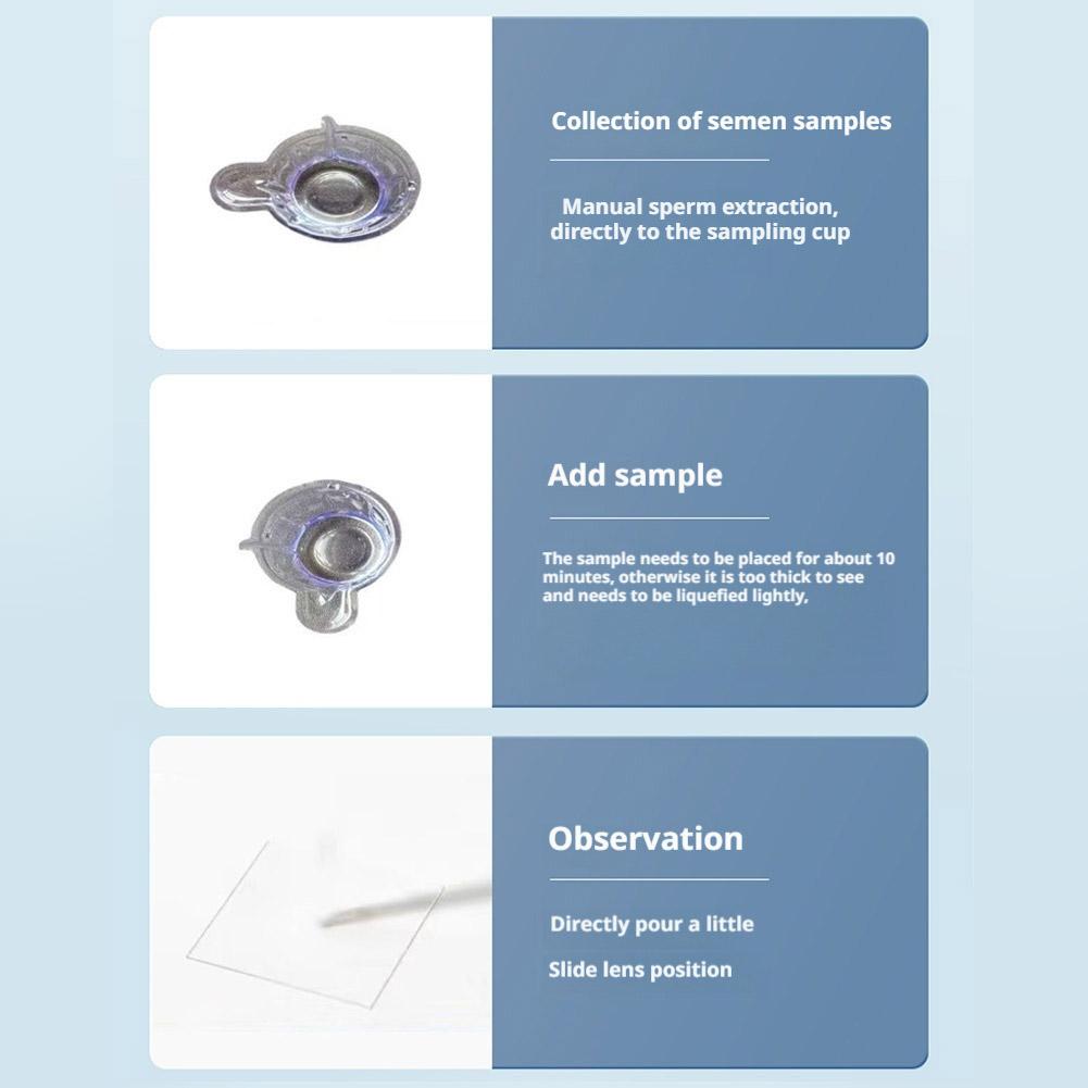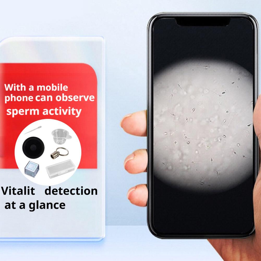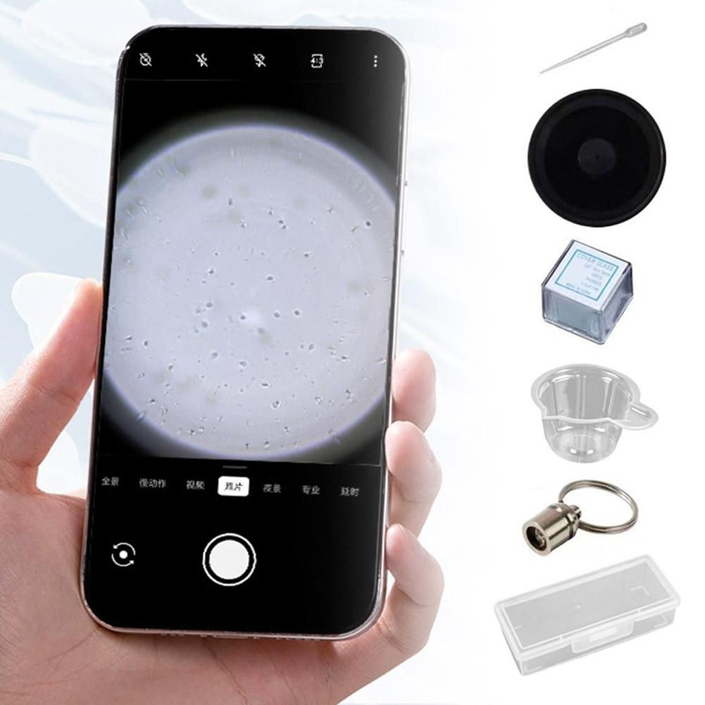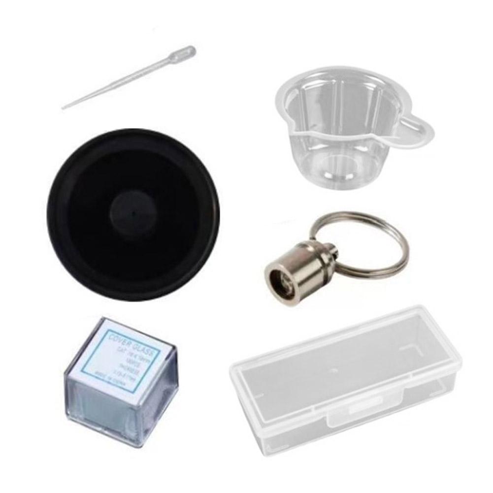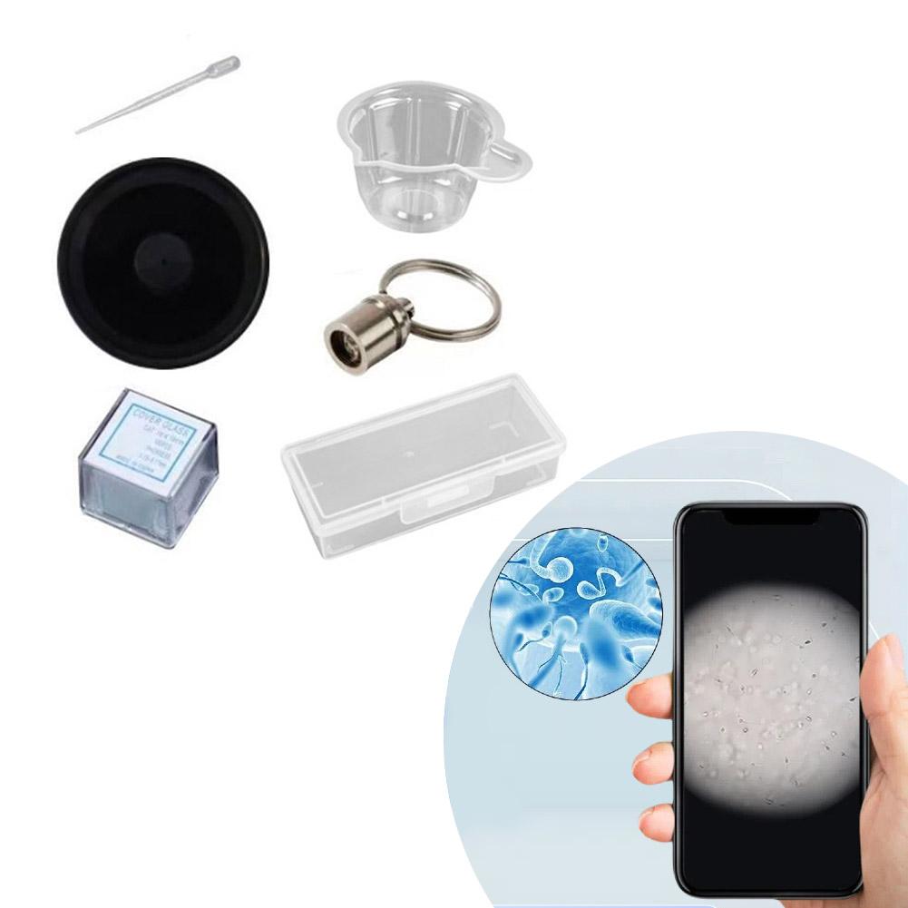 Package includes: Reusable packaging box, 1 reusable microscope magnifier, 1 reusable light source, 100 observation slides (disposable), 1 sampling cup, 1 sampling dropper