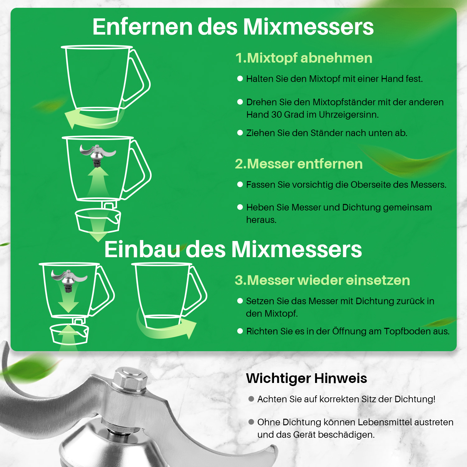 Die Design ermöglicht eine unkomplizierte Installation. Sie benötigen keine 额外的工具 (Zubehörwerkzeuge) oder Fachkenntnisse, um sie einfach austauschen zu können. Diese einfache Montage für Zubehör macht Ihre Küchenmaschine praxisorientiert und nutzerfreundlich, was Ihren Kochensprozess effizienter und angenehmer gestaltet.