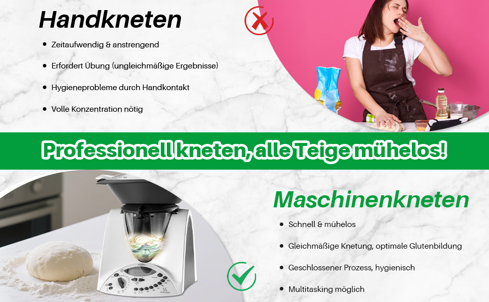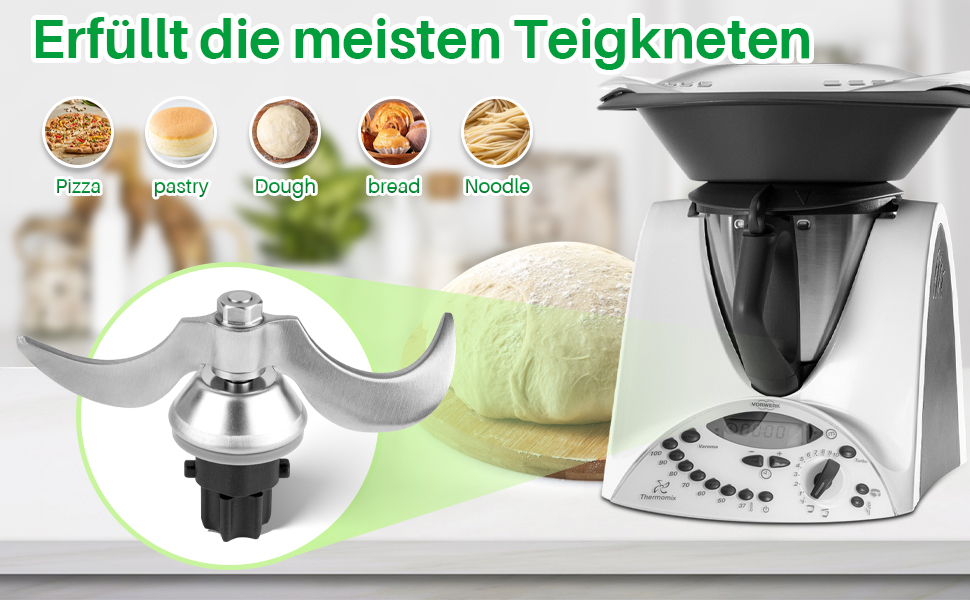 Sie erzielen optimale Ergebnisse. Das Messer knetet Hefeteig so, als wäre es handgearbeitet, was die bestmögliche Qualität gewährleistet. Dadurch ist es ein unverzichtbares Zubehör für jeden Besitzer einer Thermomix TM31, der regelmäßig Teig zubereitet. Zudem geringere Geräusche bedeuten einen sicheren Umgang und eine einfachere Reinigung.