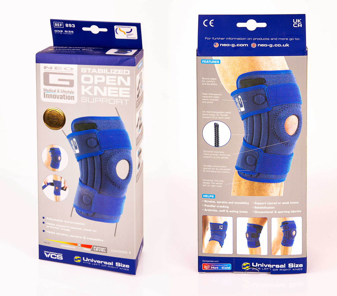 This is for 1 (ONE) NEW, FACTORY SEALED NeoG STABILIZED OPEN KNEE SUPPORT #893 UNIVERSAL SIZE FOR RIGHT OR LEFT KNEE. This is a new unused item that has never been worn.