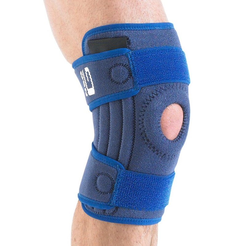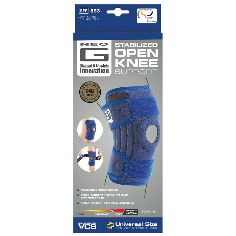 The Neo G Stabilized Open Knee Support provides adjustable, heat-therapeutic neoprene support for injured or weak knees, featuring metal spiral stays for flexible stability, an open patella design with a buttress for tracking, and adjustable straps for a universal, comfortable fit, helping with strains, sprains, arthritis, and general instability by warming muscles and evenly distributing joint pressure.