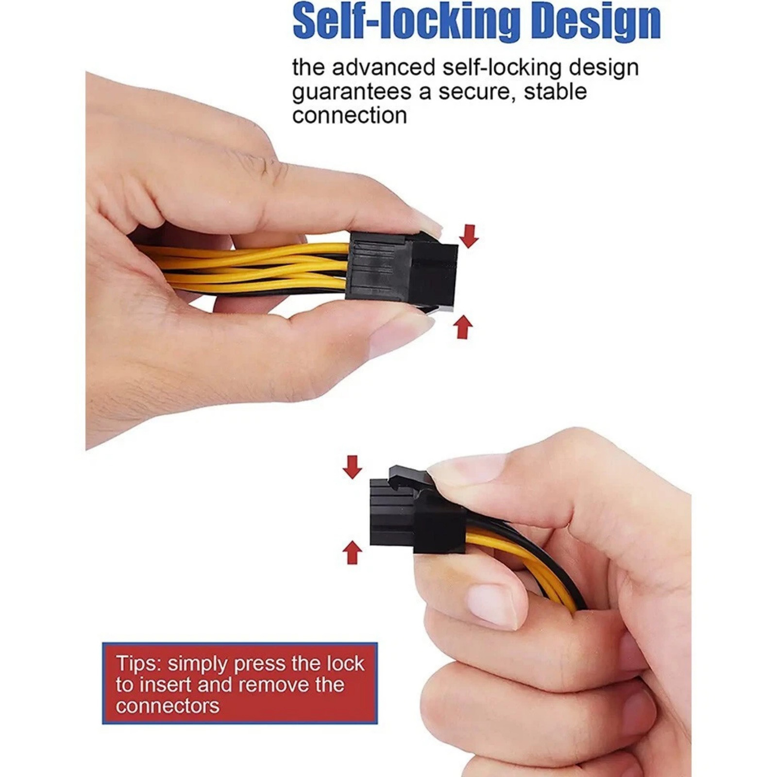 Sturdy graphics card pcie power cable has an 8 pin male PSU pcie connector with a latch and a female 6 pin PSU pcie connector with keyed rails for a secure connection on each end to prevent accidental disconnections
