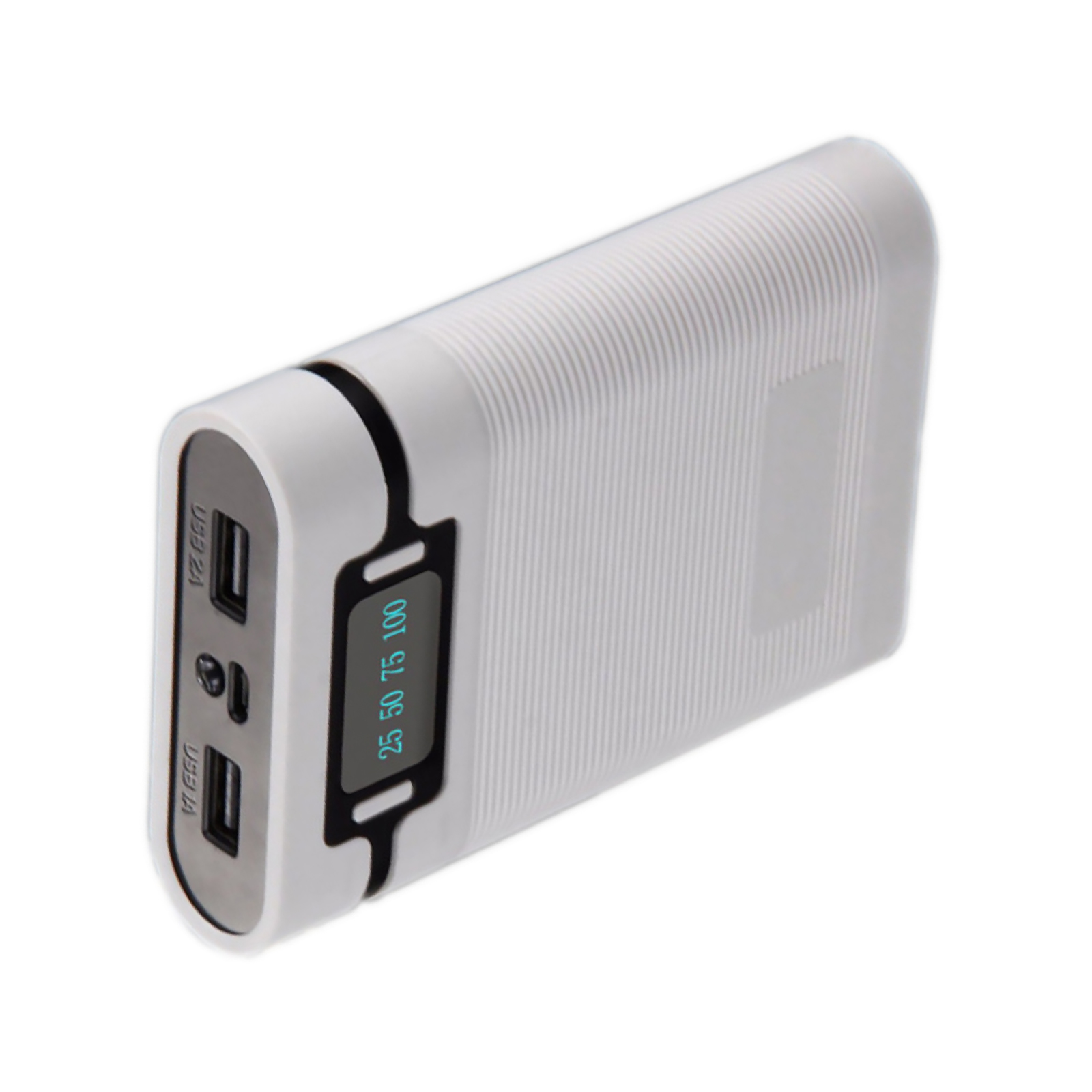 Color: Black, White Capacity: 2000mAh-12000MAh USB Ports: 2 USB ports Output:5V/2.5A Product Weight: 85g Dimensions:11.5*8.1*2.5cm Battery Type: 4*18650 (18650 battery not included)