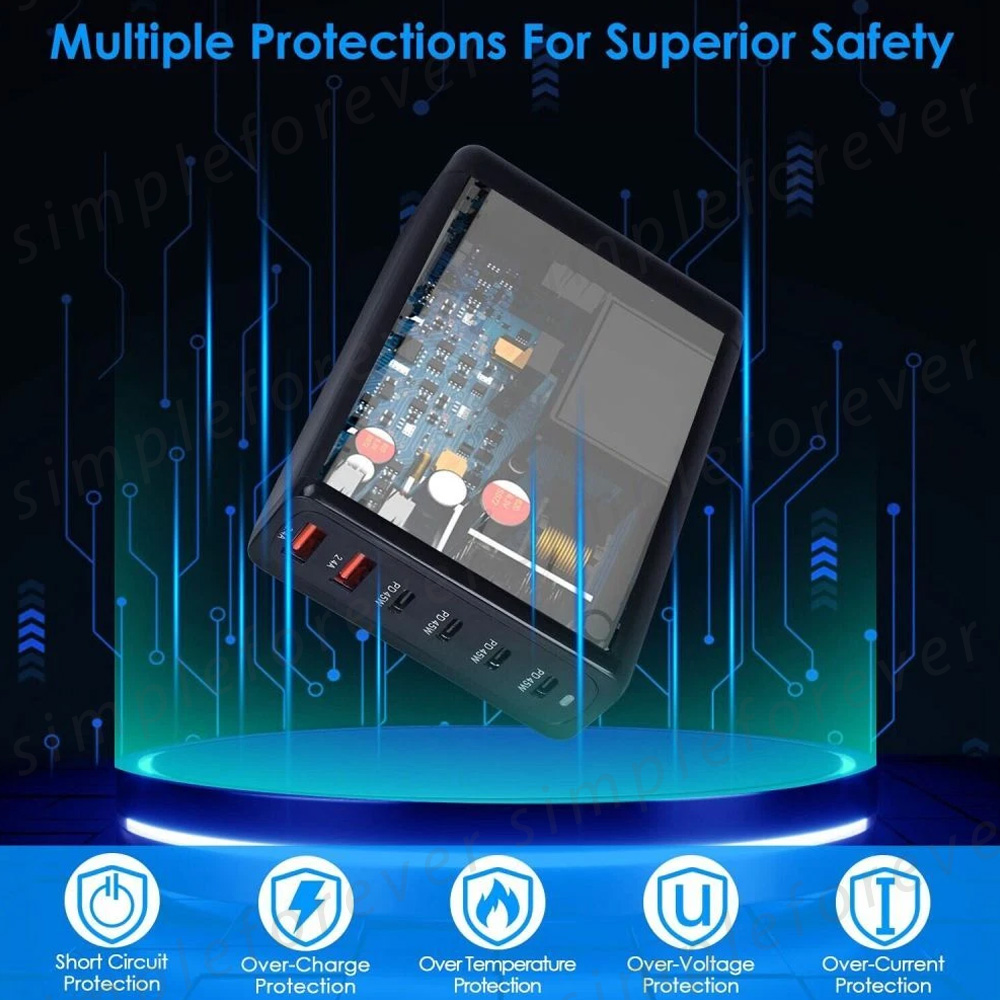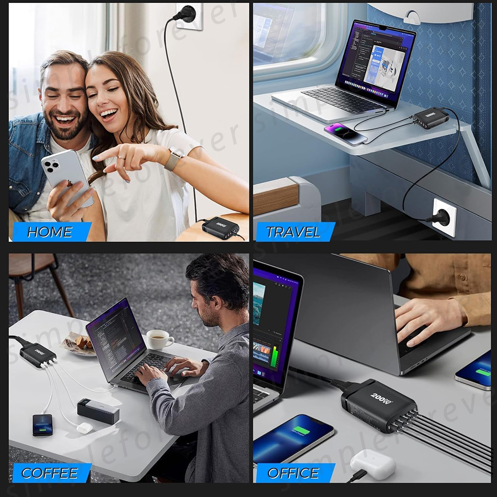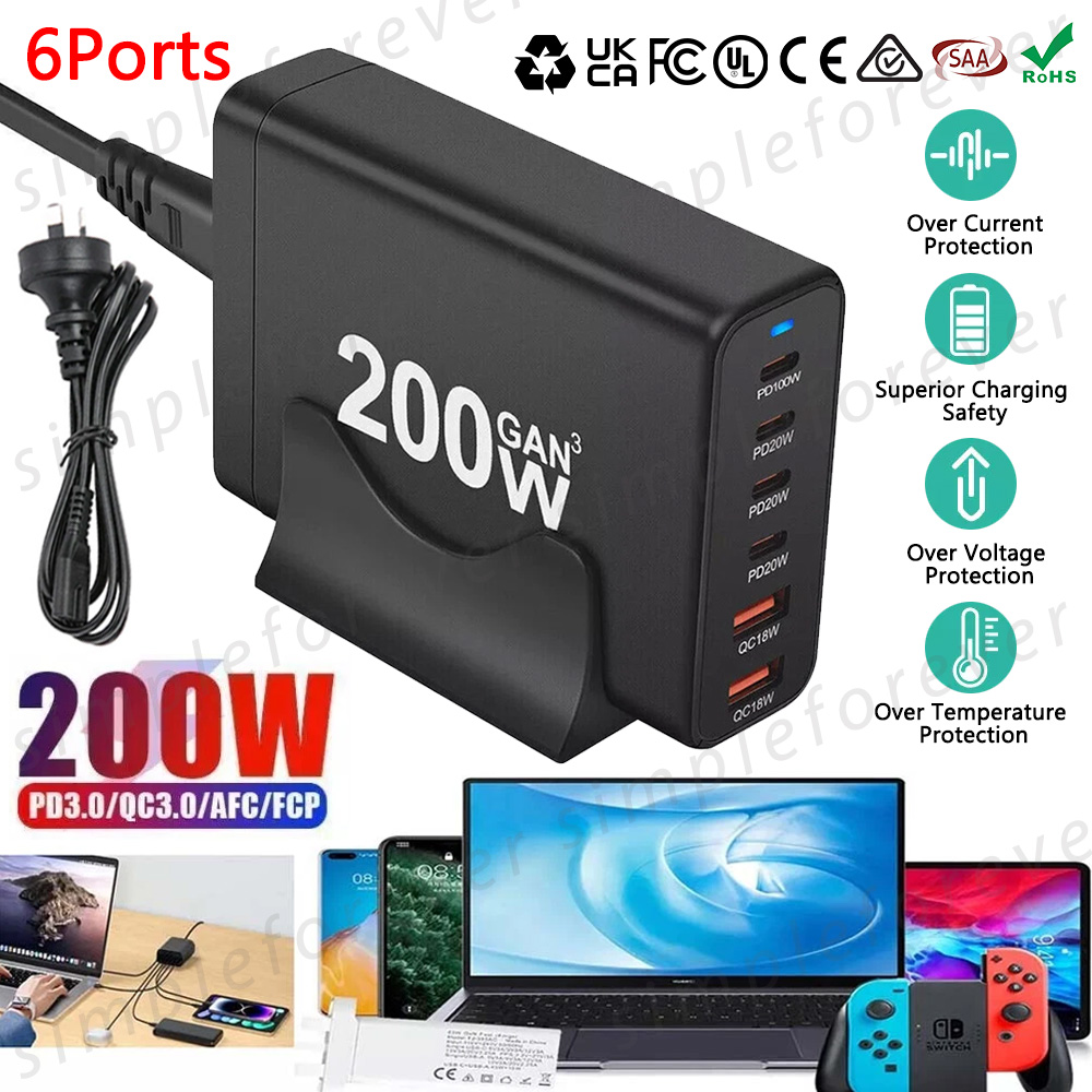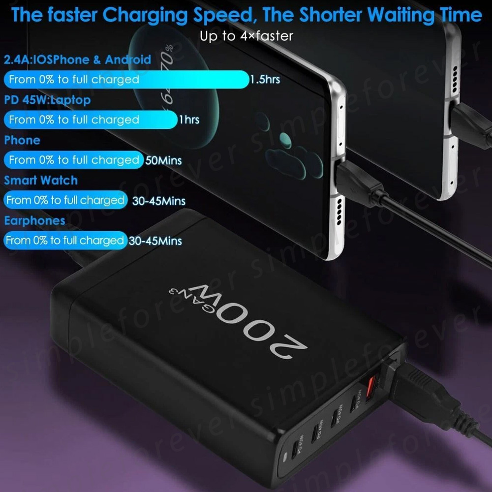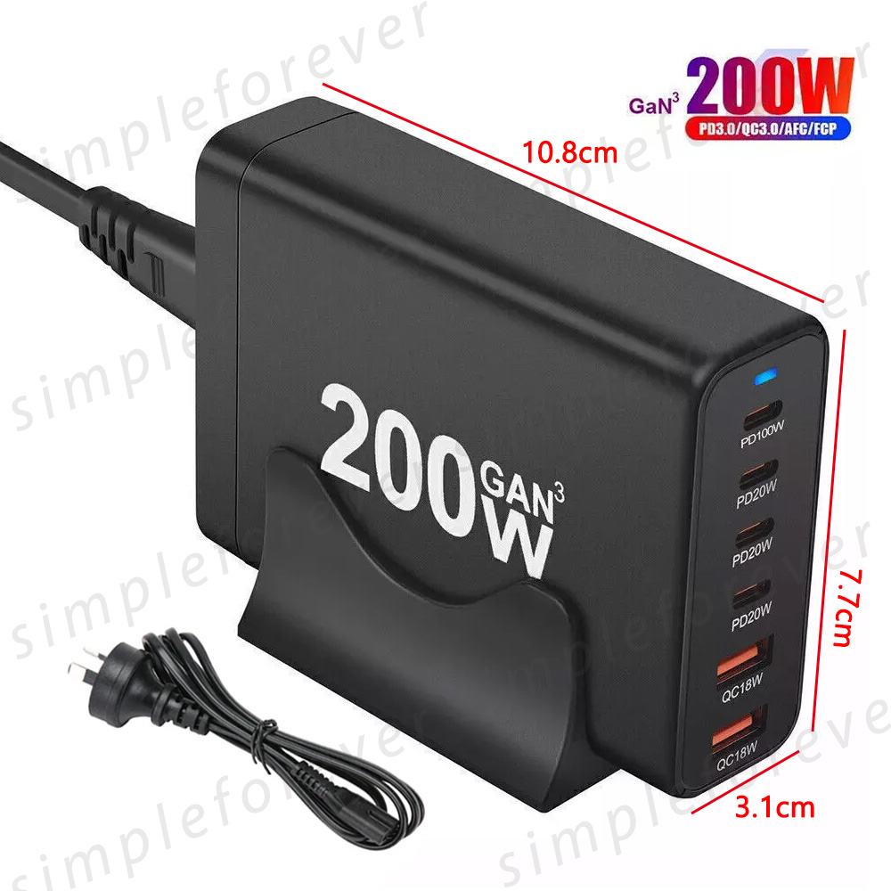 200w Gan USB C Fast Charging Station 6 Ports Pd Type C Charger For iPhone Laptop