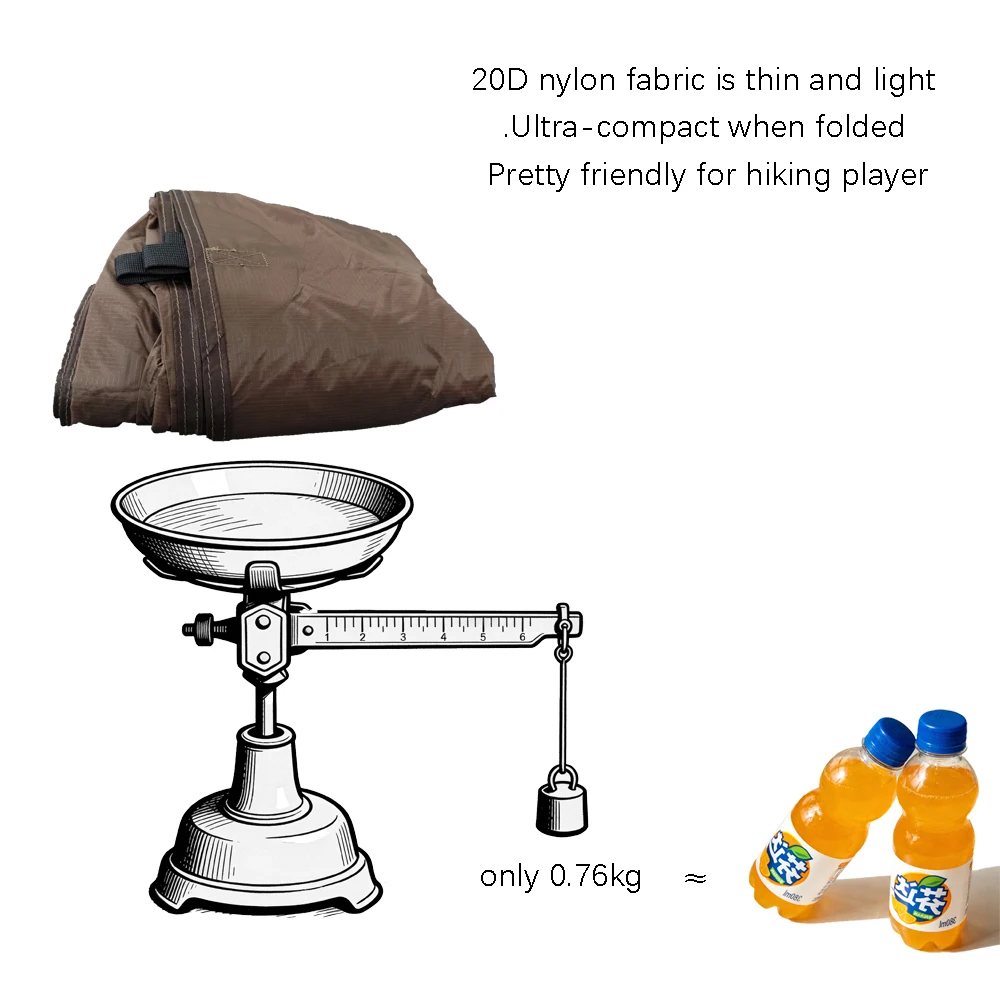 The canopy fabric itself weighs only about 760g, and its folded volume is a mere 25*20*5cm, making it easy to fit into any hiking backpack.