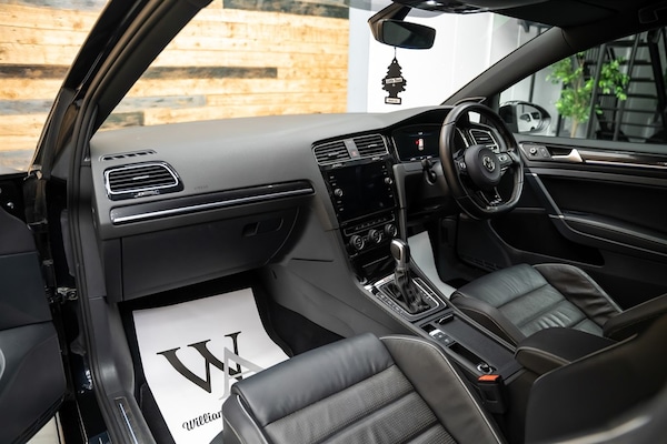 Williams Automotive Ltd are proud to bring to market this stunning 2017 Volkswagen Golf R DSG MK7.5 Finished in the lovely Deep Pearl Black with a contrasting Black leather sports interior. Coming in with low owners, low mileage, huge spec and a full extensive service history from main dealer and respected specialists. Just had a Full Major Service, Spark Plugs Replacement, Air Filter Replacement, Brake Fluid Service, DSG Service, Haldex Service, X4 Michelin PS5 Tyres & Comprehensive Vehicle Health Check costing in excess of £1,500 with invoices present! Supplied with all supporting documentation, both keys and manuals. This beautiful Golf R not only looks great but it also has a brilliant factory specification and some subtle modifications making it stand out from the rest, some include the sought after Heated Black Vienna Leather R Embossed Sports Seats, Dynaudio Speakers (Rare Option), Deep Pearl Black Paintwork (Looks Phenomenal), 18"" Cadiz Wheels wrapped in like new Michelin PS5 Tyres, Adaptive Cruise Control with Brake Function, Virtual Cockpit, 7 Speed DSG, Auto Hold, Auto LED Headlights with Daytime Running Lights, Auto Wipers, Res Delete (Sounds Immense), Maxton Rear Spoiler, Navigation, Bluetooth, Apple CarPlay, USB Input, Lap Timer, 3 Door, Digital Dual Zone Climate Control, Blue Ambient Lighting, 4 Motion, Piano Black Trim, R Kick Plates, Driving Modes - ECO - NORMAL - RACE - INDIVIDUAL and so much more! This Golf R is well known to us, having been previously supplied by Williams Automotive Ltd and it’s a pleasure to have it return to our showroom. It has clearly been owned and maintained with care, reflected in its excellent condition, impressive service history and how it drives. Comes with a 6 month premium warranty from Autoguard as standard, with the option to extend for additional peace of mind. Finance options available and part exchange welcome. Viewings are strictly by appointment to ensure a personalised and unhurried experience.