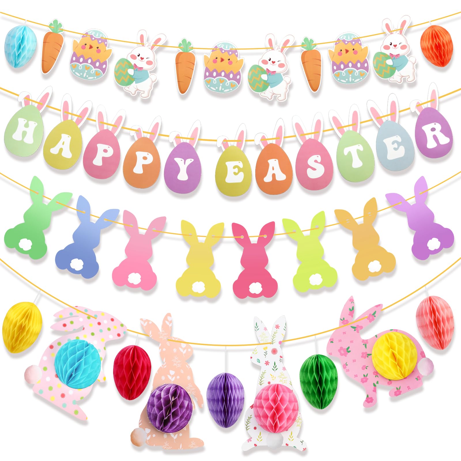 - Happy Easter Designs: All our Happy Easter Hanging Decorations Easter Bunting and Easter Honeycomb Centerpiece are designed with Happy Easter, Easter Egg, Easter bell, Easter Bunny, etc, These traditional Easter decorations will give your space an abundance of Easter festive flair.
