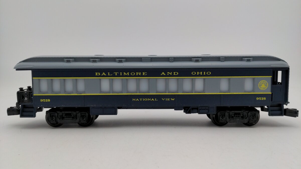 Here is a Lionel 6-9518 O Gauge Baltimore and Ohio National View Observation Car from 1975. It features a durable ABS body, an illuminated interior, plastic trucks with a fixed knuckle coupler and it measures 12 inches long.