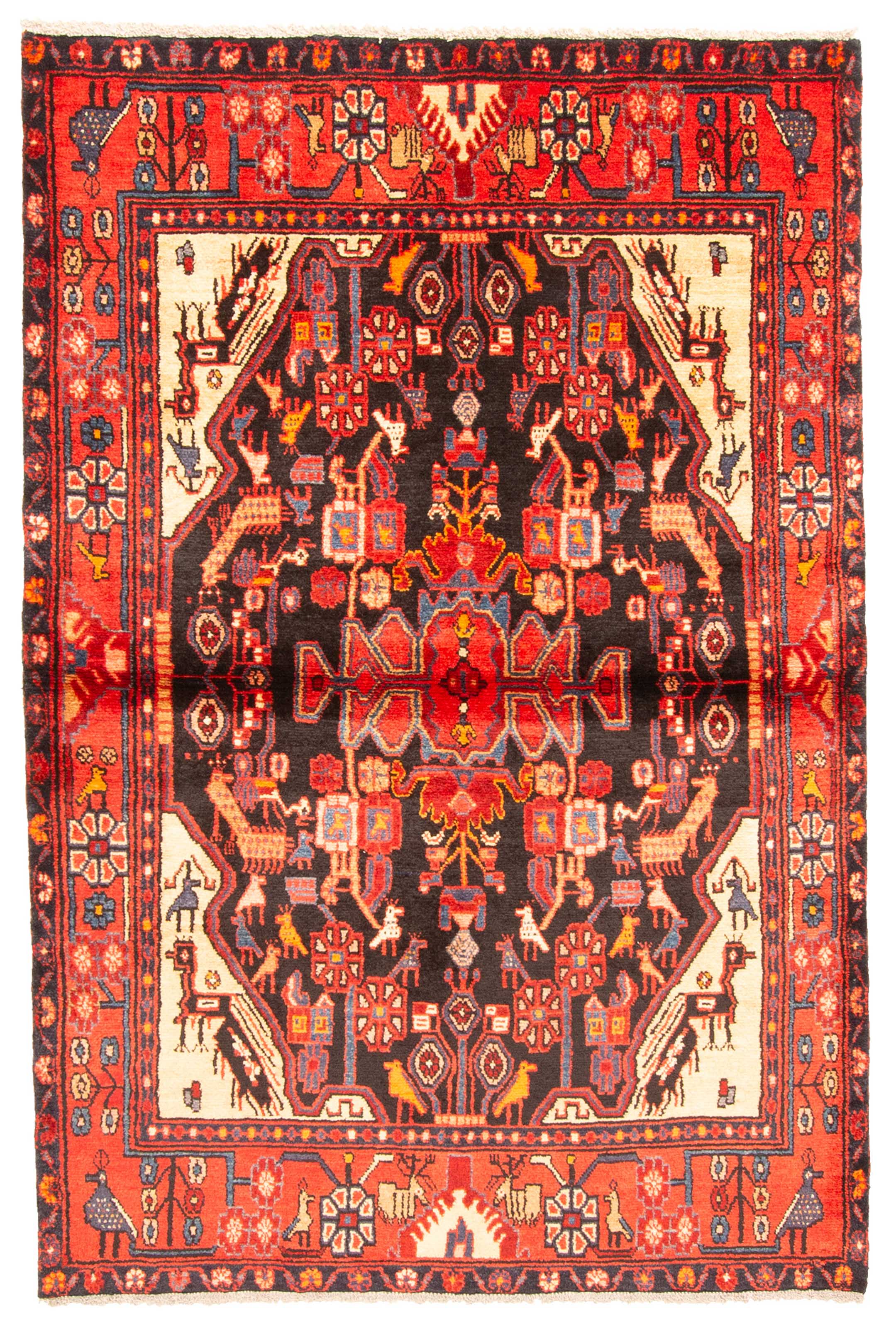 Anadol rugs are handmade by semi-nomadic tribes who live along the Anatolian Mediterranean coast Traditional style rug with Beige, Black, Dark Blue, Red accent colors Imported from Turkey and crafted using the finest weaving techniques Hand-knotted and constructed from 100% Wool with 100% Cotton foundation 4-Feet 5-Inch by 6-Feet 7-Inch (135cm x 200cm)