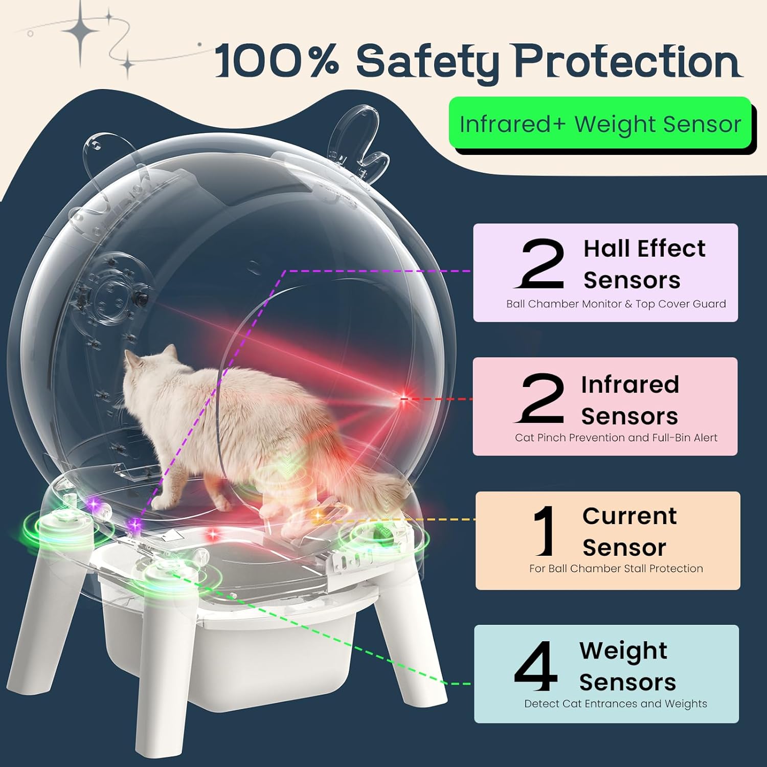 【Cat Litter BoxComprehensive 9-Sensor Safety Protection】:Smart Cat Litter Box Engineered for total peace of mind with 9 precise sensors: 4 weight sensors, 2 infrared sensors, 2 Hall effect sensors, and 1 current sensor. Automatic cat litter box This multi-layer system provides all-around safety, ensuring immediate stop responses to your cat's presence.