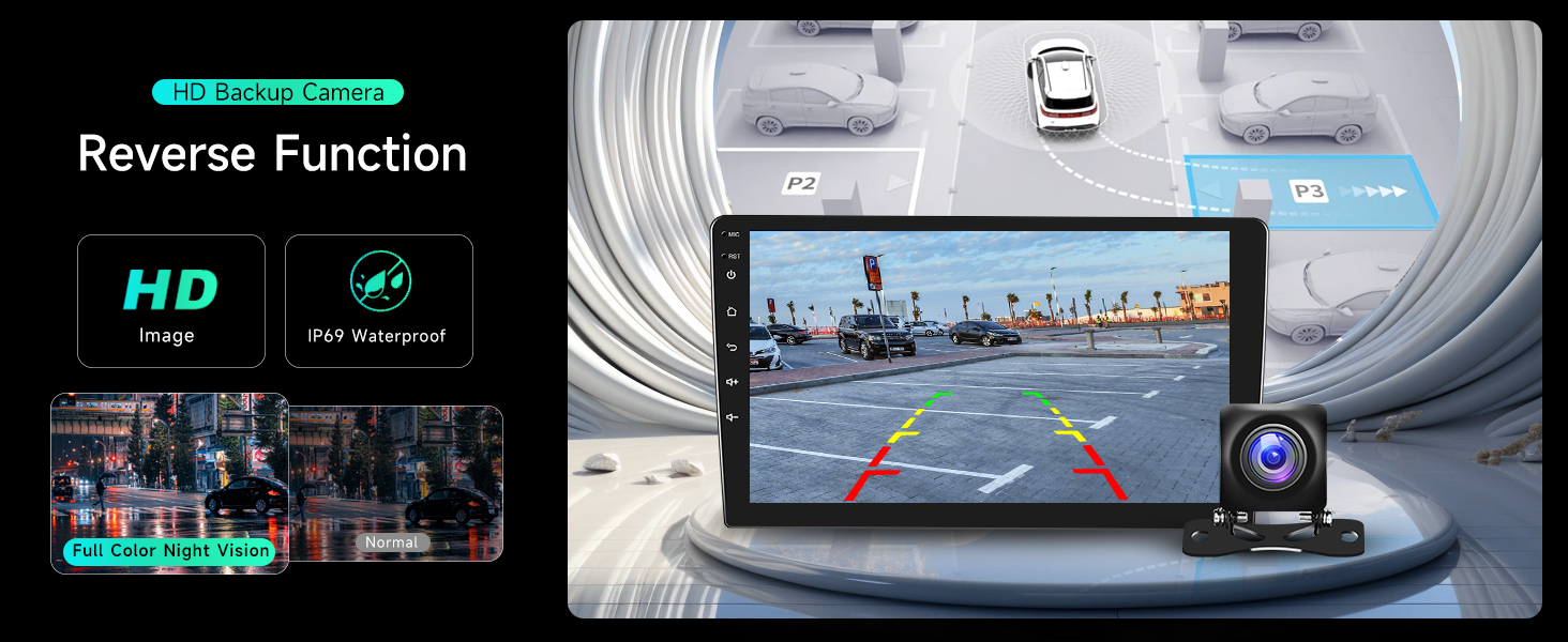 Rear camera: Comes with an AHD high-definition 1080P night vision waterproof camera, giving you a clearer night vision experience.