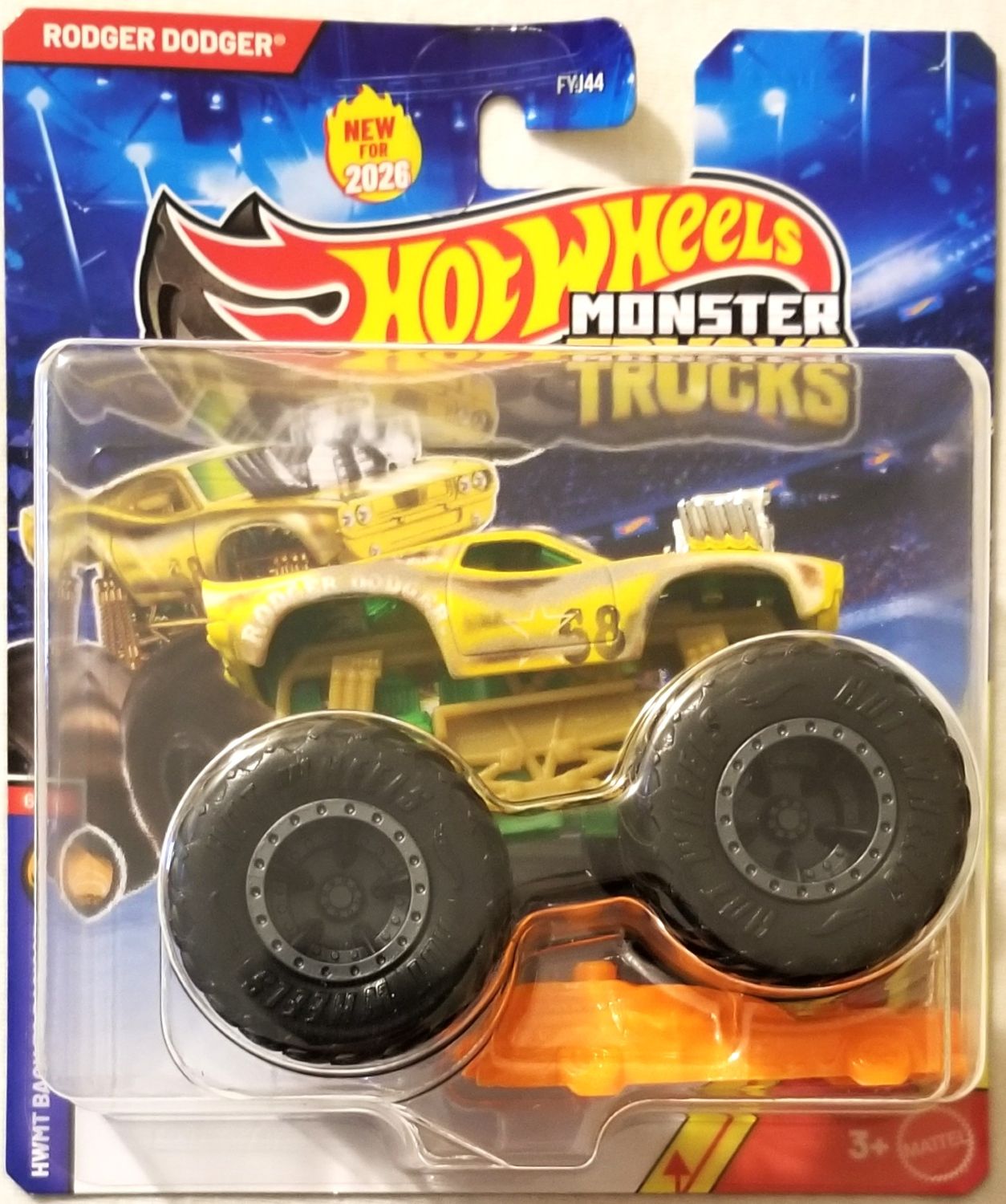 This is a Brand New Hot Wheels - 2026 Monster Trucks HWMT Back To Basics 6/8 Rodger Dodger, 1:64 Scale. It includes a crashed car.