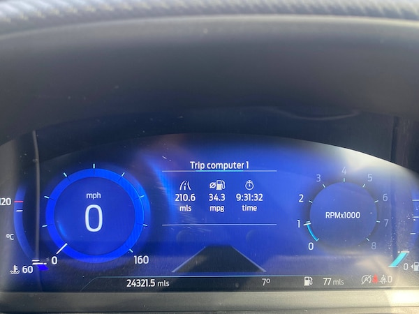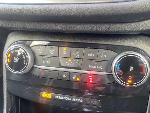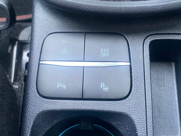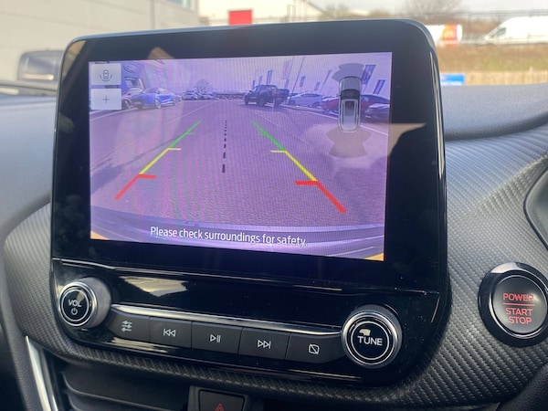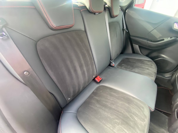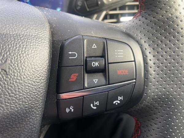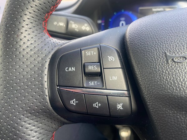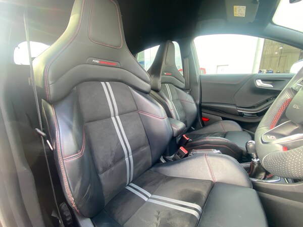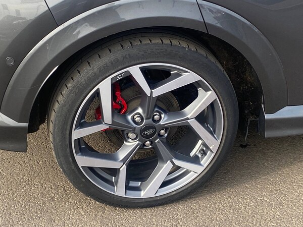 3 rear seatbelts, Autonomous emergency braking, Child safety lock, Electronic stability control (ESC) and hill start assist, Pedestrian/cyclist detection and post-collision braking, Pre collision assist system, Red brake calipers, Tyre pressure monitoring system (TPMS), Cruise control with Intelligent speed assist, Driver impairment monitor, Emergency call service, Ford easy fuel, Front and rear parking sensors, Full digital 12.3 inch instrument cluster, Lane keeping aid with lane departure warning, Manual tailgate, Power assist steering, Selectable drive modes (normal, sport, eco, track), Speed sign recognition, Automatic headlights with auto high beam, Automatic rain sensing wipers, Body coloured door mirrors, Body coloured roof, Dual chrome exhaust, Fixed LED signature headlamps, Front fog lamps, Large rear spoiler, LED daytime running lights, LED rear lamps, Power foldable heated door mirrors with puddle lamps and puma logo protection, Premium paint, Privacy glass to side rear windows and tailgate glass, Quickclear heated windscreen, Rear side wing doors, Rear wiper, ST scuff plates, Third brake light, Unique ST body styling kit including wing mirrors and Ford Performance embossed splitter, 3 seat bench in 2nd row, Alloy sports pedals, Centre console with armrest and stowage, Ford megabox extended bootspace, Ford Performance sensico partial premium leather upholstery with metal grey stitching, Front and rear floor mats, Front and rear head restraints, Manual 6 way driver seat adjust with lumbar adjustment, Manual 6 way passenger seat with lumbar seat adjustment, Single front passenger seat, ST flat bottomed steering wheel with metal grey stitching, ST logo projection, Unique ST gear shift knob, Wireless charging pad with electronic air temperature control (EATC), BandO Premium Audio system + Ford SYNC 3 navigation pack - Puma, Winter pack - Puma, Engine sound enhancer, ST suspension, Carbon look interior deco spears, Keyless entry and power start button, Thatcham alarm, 19 inch 5 Spoke magnetite dark finished alloy wheel, Tyre inflation kit