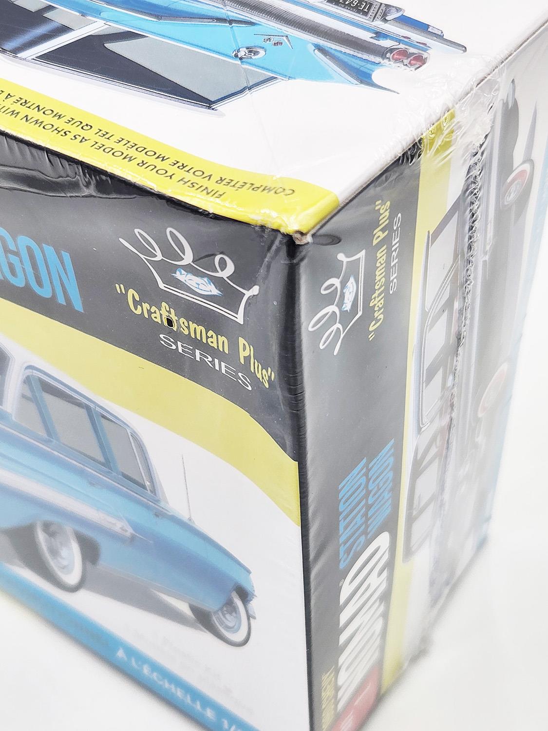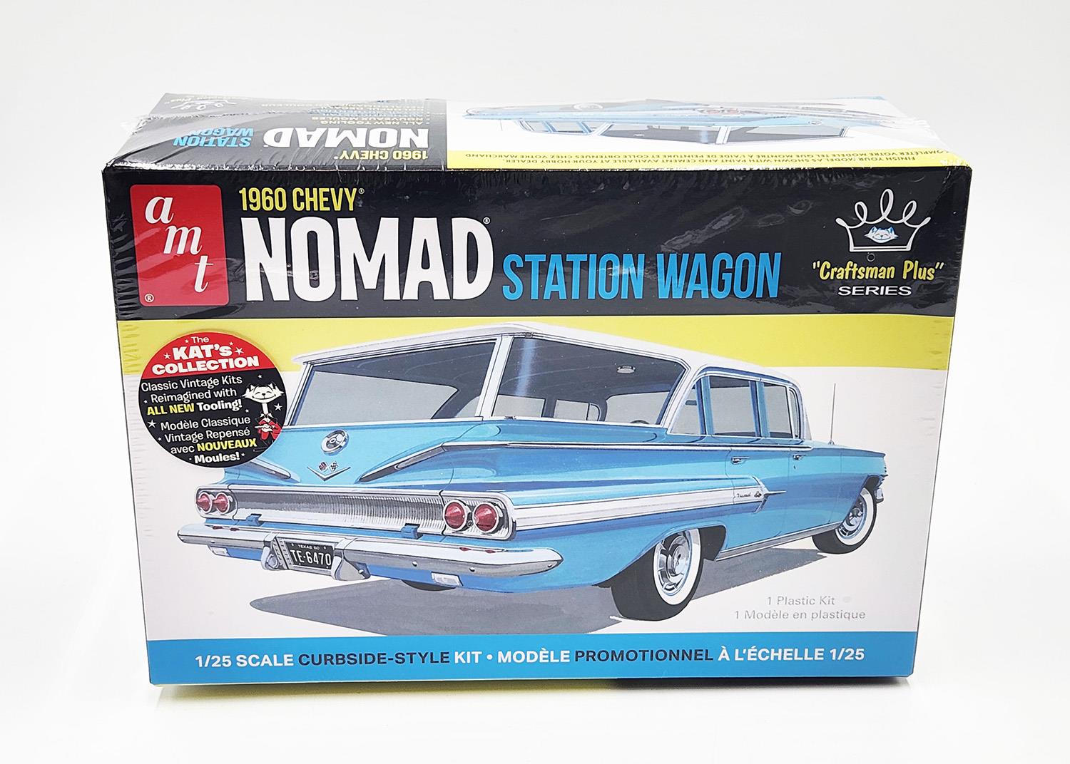 AMT 1960 Chevy Nomad Station Wagon Craftsman Plus 1:25 Scale Model Kit. Featuring all-new tooling, AMT's Craftsman Plus kits are simple enough for beginners, but with enough detail to satisfy even the most seasoned model builder! Craftsman Plus kits are "curbside-style" making them fast, fun and easy to build. A simple engine plate replaced a multi-piece motor to speed up assembly and finish a beautiful replica in a reduced amount of time. This kit is all wrapped up in AMT’s vintage-style packaging and includes a set of colorful, waterslide decals.