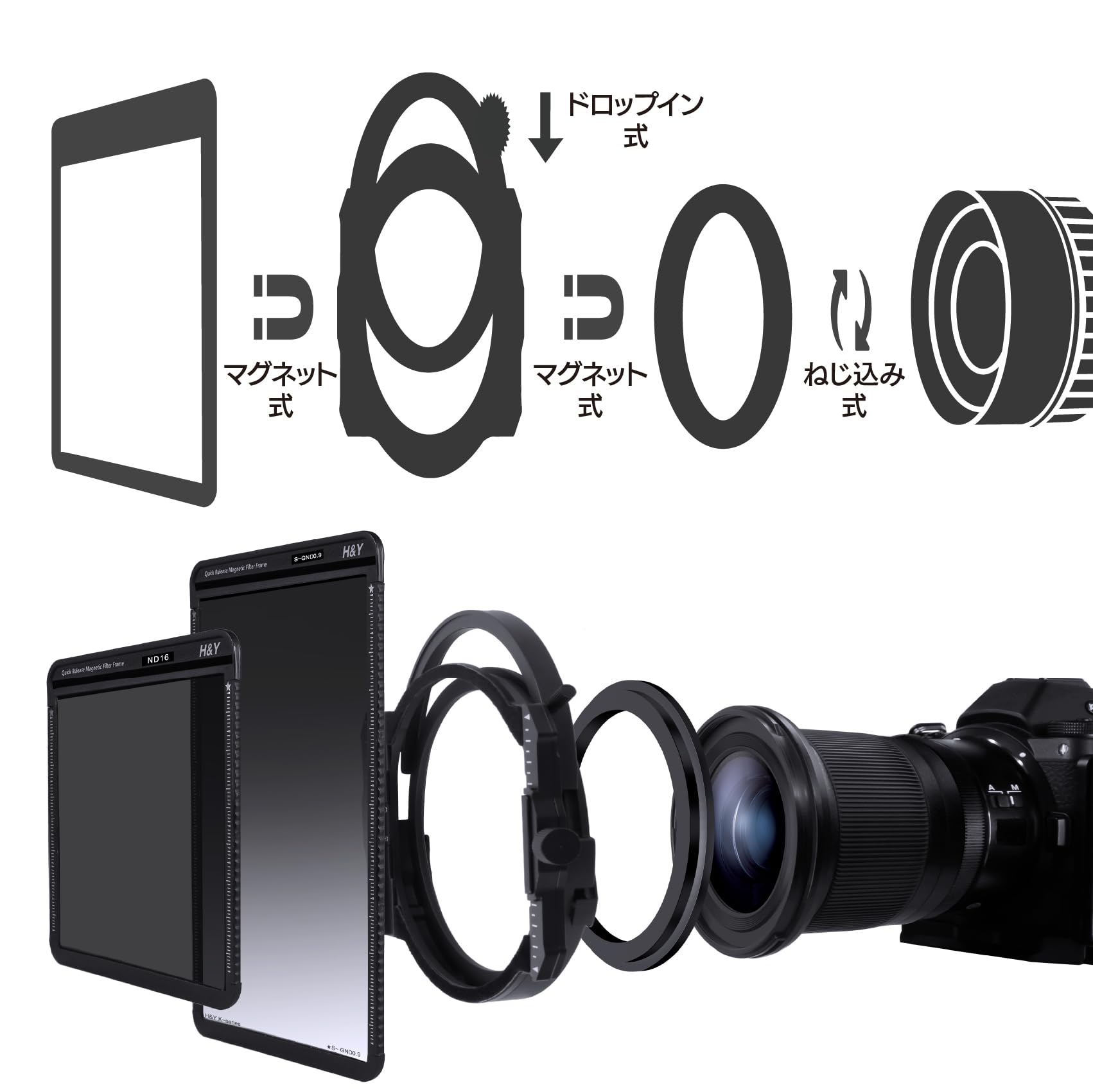 [H&Y 100mm Filter Holder Mark III + CPL Set] Kit Contents / 100mm K Series Filter Holder Mark III, Drop-in Natural CPL, Filter Holder Pouch *Holder adapter and square filter are sold separately. The included CPL filter is a natural CPL with almost no unnecessary color fog, faithful color reproduction, and low reflectance. ■ [Advanced Points in MarkIII] In MarkII, the adapter ring was attached to the filter holder by dropping it onto the back of the holder and tightening it with a lock screw, but now it can be attached with a single touch using a magnet and has a sliding lock, ensuring even faster setting and safety. ■[Patented magnetic frame + drop-in type holder] The square filter can be attached and detached using a magnet. Filters that require a rotating frame, such as CPL filters, are drop-in type, and the effect can be adjusted by operating the dial on the filter frame. It can be put on and taken off and adjusted in the shortest possible time even when wearing gloves in the dark or cold, and it is easy to layer. Realizes the most comfortable filter work ever. ■ [Compatible with a wide variety of lenses] The optional adapter ring is a magnetic type that can be connected to the holder with one touch, and is compatible with filter diameters of 49 mm to 95 mm. *It is shared with the magnetic adapter [RM-AR] for the REVORING Swift system. *Adapters for ultra-wide-angle lenses from various manufacturers will be released soon ■ [A wide range of filters] In addition to H&Y's 100x100mm and 100x150mm square filters with magnetic frames, we also have a wide variety of dedicated drop-in filters, including the standard CPL, CPL+ND, ND, Night filter, as well as soft, cross, and streak types. ■100mm K-Series Filter Holder Mark III holder + drop-in natural CPL filter