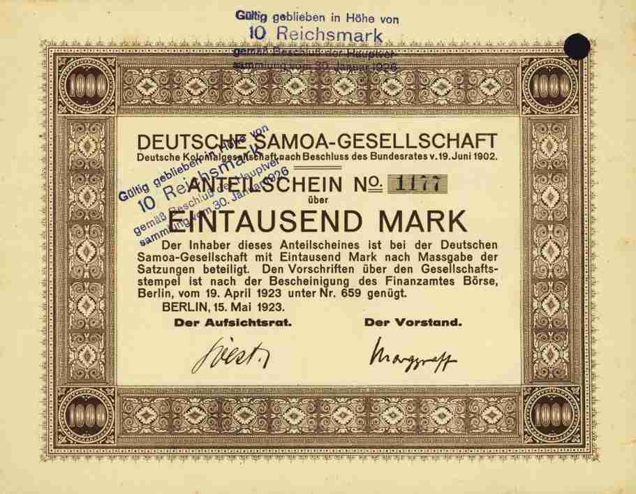 Rare Aktie aus BaroV 5 -- nur 36 Stück waren weltweit verfügbar ## Orginalaktie -- siehe Archivbild -- der Deutsche Samoa Gesellschaft, Berlin (Kolonial). Anteilschein über 1000 Mark vom 15. Mai 1923, am 30.1.1926 umgestellt auf RM 10.-. Größe: 190 x 245 mm. Betrieb der Plantagenwirtschaft in Samoa oder in anderen überseeischen Ländern, Grundbesitz zu erwerben und zu verwerten, auch gewerbliche und Handelsgeschäfte, welche damit in Verbindung stehen, zu unternehmen. Gegründet am 22.3.1902. Entwicklung: Die Kakaopflanzungen der Gesellschaft in Samoa wurden enteignet und konnten nicht zurückerworben werden. Die Gesellschaft beschloß daher, die ihr in den Jahren 1924/25 zugesprochenen Entschädigungen in Afrika zu verwerten. Es wurde eine Unterbeteiligung bei der Guatemala-Plantagen-Gesellschaft, die eine Pflanzung Likomba in Kamerun erworben hatte, eingegangen. Diese Unterbeteiligung wurde 1934 aufgegeben. Im Jahre 1935 erwarb die Deutsche Samoa-Gesellschaft die Kontrolle der Debundscha-Pflanzungs-Gesellschaft in Kamerun. Das Grundkapital der Deutsche Samoa-Gesellschaft hatte 1943 die beeindruckende Höhe von nom. RM 5170.- in 517 Anteilen zu je RM 10.-. Großaktionär um 1945: Familie Schlubach-Ringel, Hamburg. Papier, lochentwertet, in guter Erhaltung: VF+. SIEHE GROSSBILD !! Sammlerfreundlicher Startpreis!