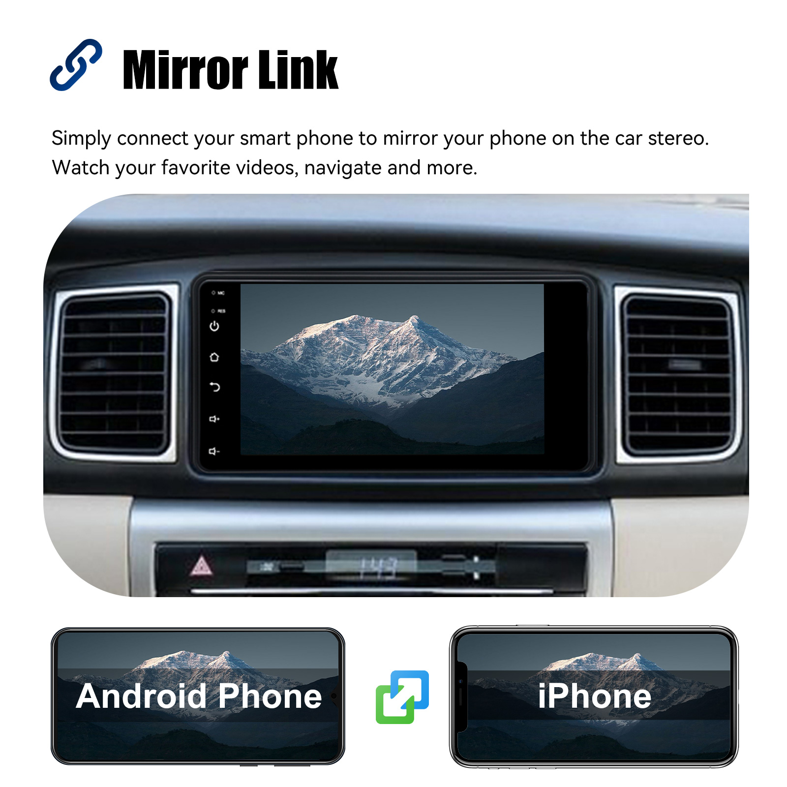 MIRROR LINK & APPLE CARPLAY & ANDROID AUTO: With this car radio, you can experience the amazing Mirror Link function, compatible with iOS and Android phones. You can mirror your smartphone screen to the car radio using apps like Google Maps, Spotify, Youtube, etc. Replace your cell phone with the car screen and turn your vehicle into a smart platform. Immerse yourself in a seamless and user-friendly infotainment experience with Apple CarPlay & Android Auto. Connect your iPhone to Apple CarPlay or your Android smartphone to Android Auto and securely access calls, texts, navigation, music and more. With intuitive operation via the touchscreen or voice control, you have all functions at your fingertips while you remain safely at the wheel. Use your favorite apps and stay connected at all times while keeping your eyes on the road. Turn your vehicle into an extended hub for your mobile devices and experience a new dimension in infotainment.
