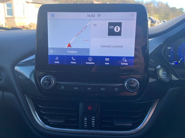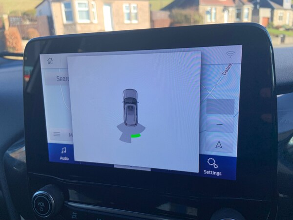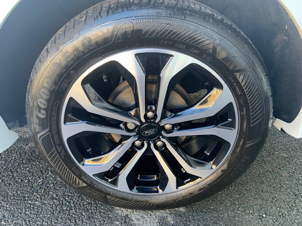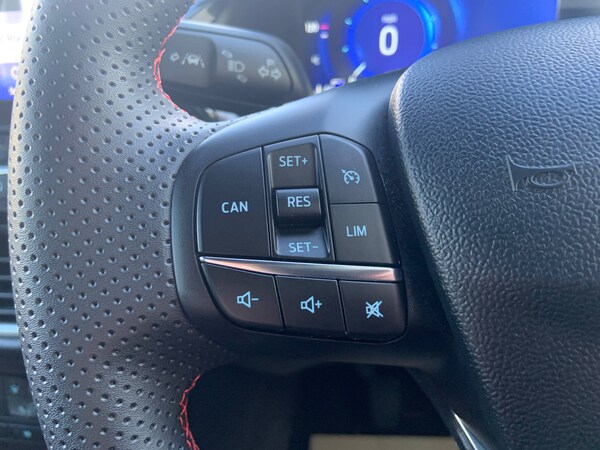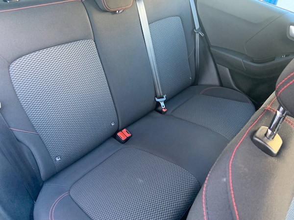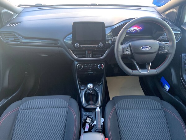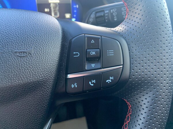 3 rear seatbelts, Autonomous emergency braking, Child safety lock, Electronic stability control (ESC) and hill start assist, Pedestrian/cyclist detection and post-collision braking, Pre collision assist system, Tyre pressure monitoring system (TPMS), Cruise control with Intelligent speed assist, Driver impairment monitor, Emergency call service, Ford easy fuel, Full digital 12.3 inch instrument cluster, Lane keeping aid with lane departure warning, Manual tailgate, Power assist steering, Power start button, Rear parking sensor, Selectable drive modes(Normal, Eco, Sport, Slippery and Trail), Speed sign recognition, Automatic headlights with auto high beam, Automatic rain sensing wipers, Body coloured door mirrors, Body coloured roof, Large body colour rear roof spoiler, LED rear lamps, Power foldable heated door mirrors with puddle lamps, Projector headlamps with LED day time running lights and front fog lamps, Quickclear heated windscreen, Rear side wing doors, Rear wiper, Solid paint, ST-Line body styling kit with unique grille, Third brake light, 3 seat bench in 2nd row, Centre console with armrest and stowage, Ford megabox extended bootspace, Front and rear head restraints, Front floor mats, Manual 2 way passenger seat adjustment, Manual 4 way driver seat adjust with lumbar adjustment, Manual air conditioning, Single front passenger seat, ST- Line cloth trim with red stitching, ST-Line flat bottomed sensico leather steering wheel with leather handbrake and aluminium gear knob, Ford SYNC 3 navigation pack - Puma, Sport suspension, Thatcham alarm, 17 inch 5x2 spoke black machined finished alloy wheel, Tyre inflation kit