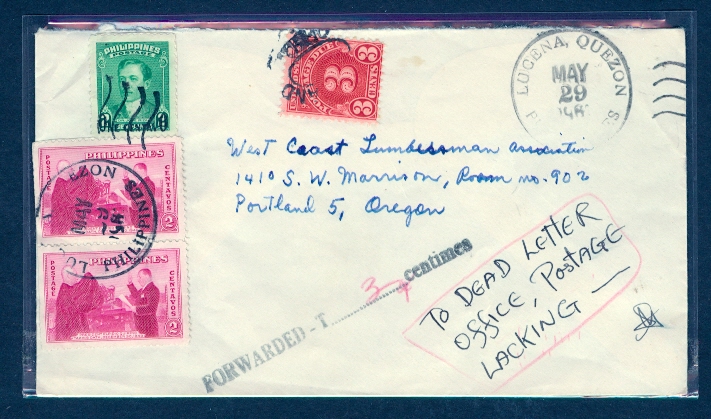 PHILIPINES sent w/o sufficent postage manuscript TO "DEAD LETTER OFFICE POSTAGE LACKING" & 3c US due applied