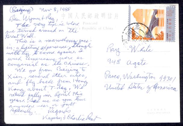 CHINA PROC 1980 PPC TO USA. Front and back shown.