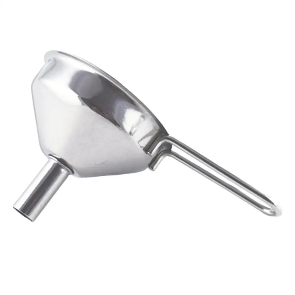 This small metal funnel is strong and durable, perfect for filling bottles, jars, flasks, and more. It has a smooth and delicate surface that prevents spills and leaks. You can easily hang it on a hook or shelf when not in use. It's also ideal for travel, as it fits in any bag or suitcase.