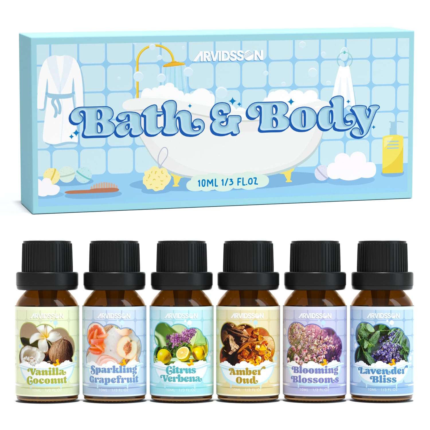 Bubble Bath Time: ARVIDSSON bath fragrance oils including Vanilla & Coconut, Lavender Bliss, Sparkling Grapefruit, Citrus Verbena, Amber Oud, Blooming Blossoms Scented Oils. They have a pretty and crisp smell, that make you feel like in a spa yoga room.