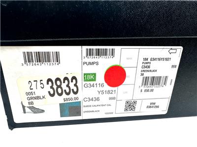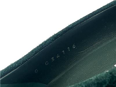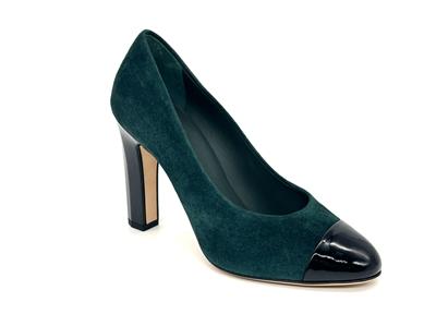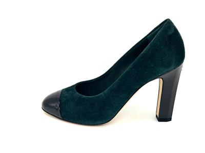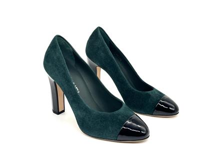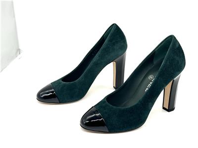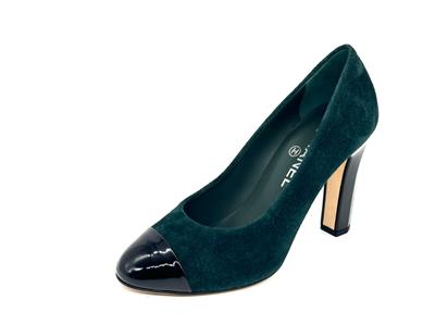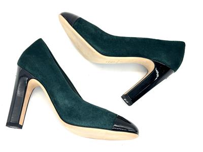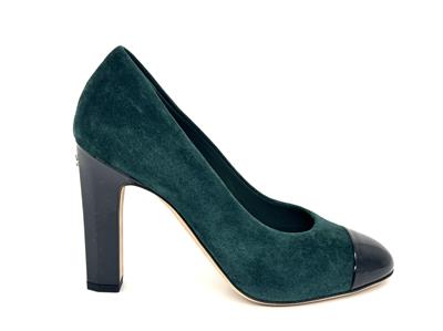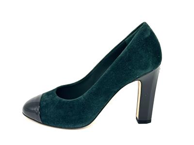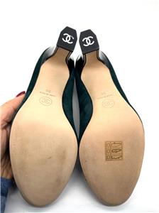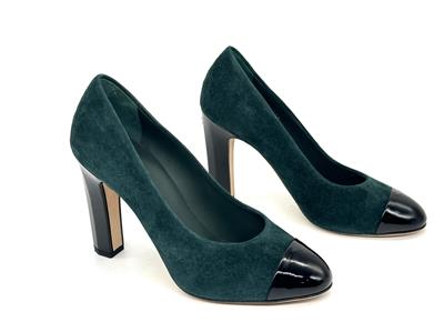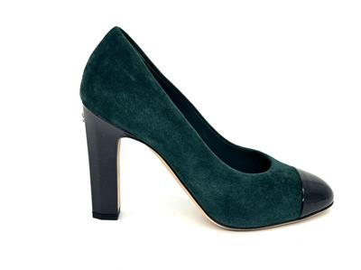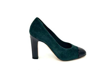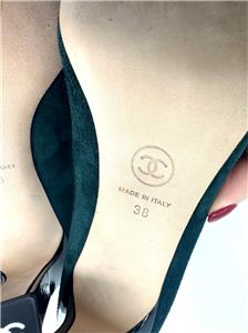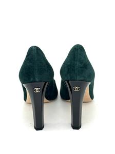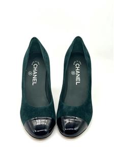 These green suede pumps feature black patent leather cap toe and black patent leather 4" sculptured heel. Silvertone CC logo at the back of the heel. Padded leather insole and leather sole. Made in Italy.