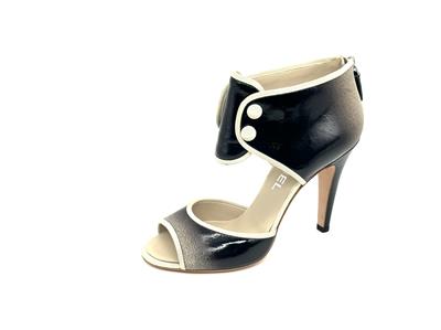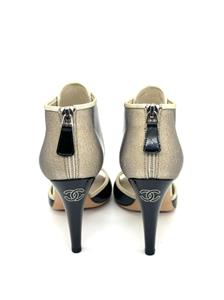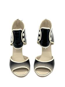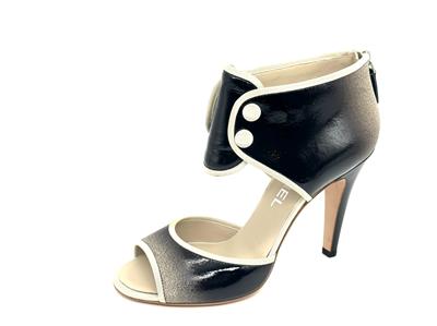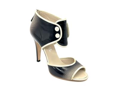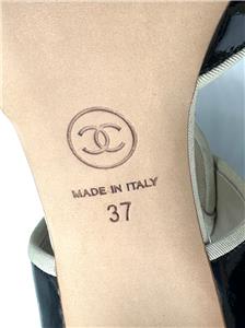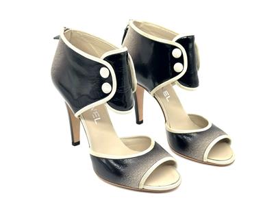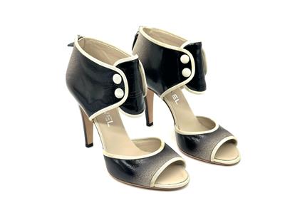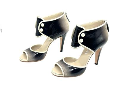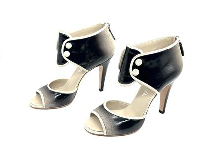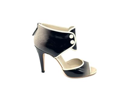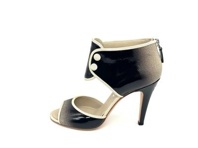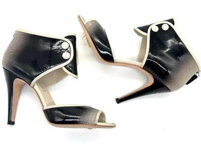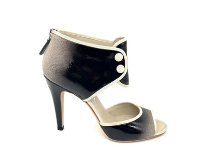 Ombre patent leather back zip sandals with open toe and a CC logo at the back of the 3.75" heel . Contrast grosgrain trim and satin covered faux buttons at the front. Padded leather insole and leather sole. Made in Italy.